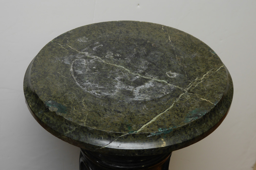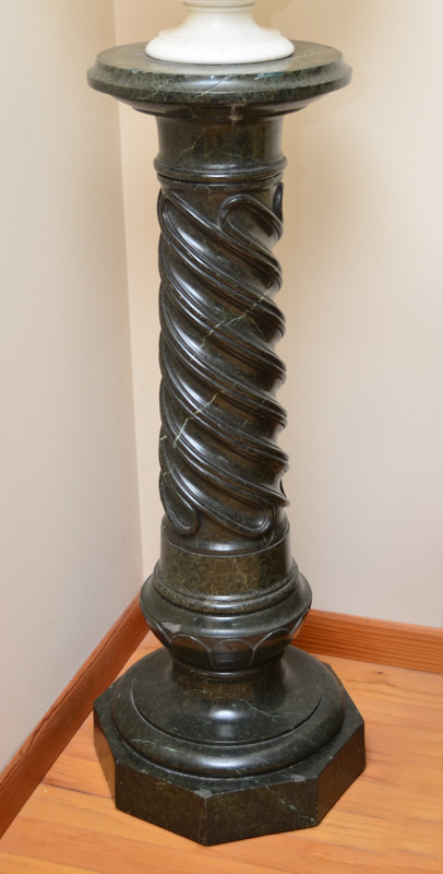 HEAVY GREEN MARBLE PEDESTAL: Twist central body, carved octagonal base. Usable top surface 12 3/8''dia. Overall measures 42 3/4'' h. x 15 1/2''.