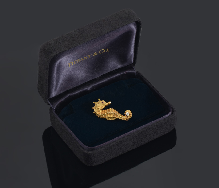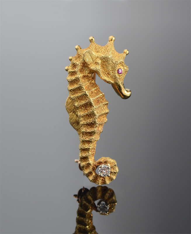 18K TIFFANY DIAMOND SEAHORSE PIN: 18K yellow gold seahorse pin contains one round brilliant cut diamond set in his tail. Weight: .05 Ct. Approx. Rated VS in clarity and F-G in color. And a 1.00 mm ruby as his eye. Bar pin closure. Length 1 1/8''. Weight: 5.6 grams. Signed: Tiffany.