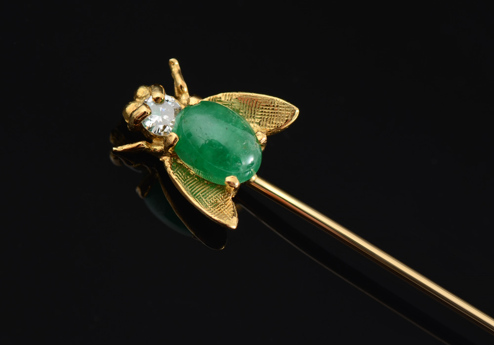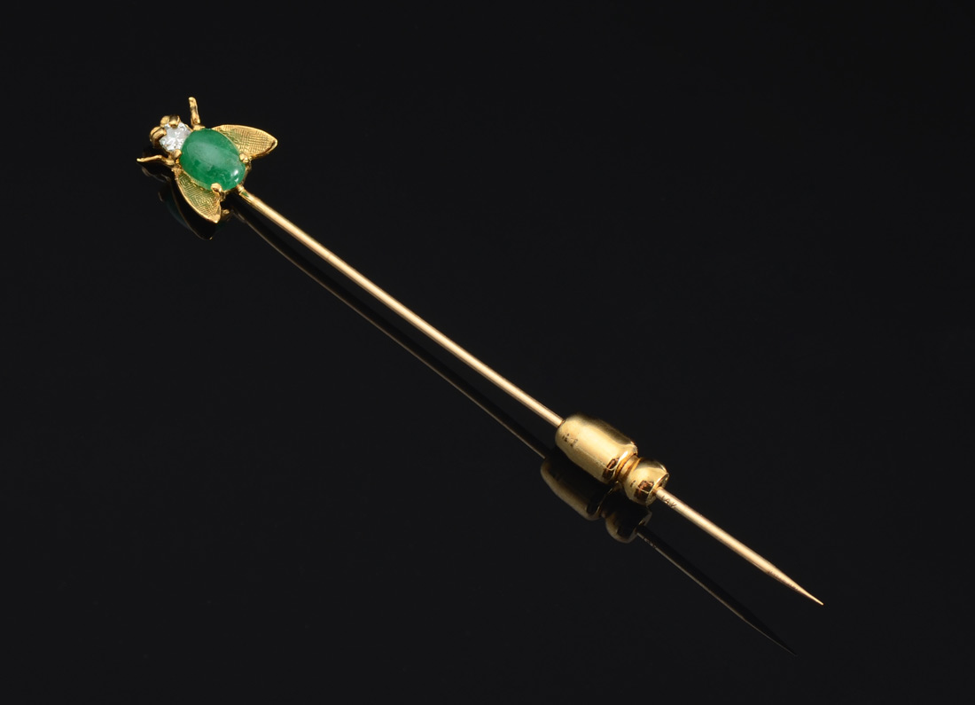18K DIAMOND & EMERALD STICK PIN: 18K yellow gold bee pin contains one round brilliant cut diamond. Weight: .07 Ct. Approx. Rated VS in clarity and F-G in color. One 6.00 x 4.00 mm cabochon emerald. Weight: 1.8 grams. Signed: Tiffany