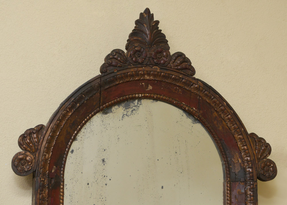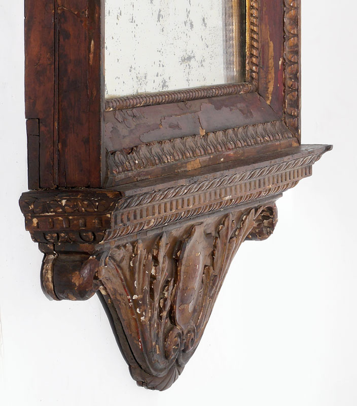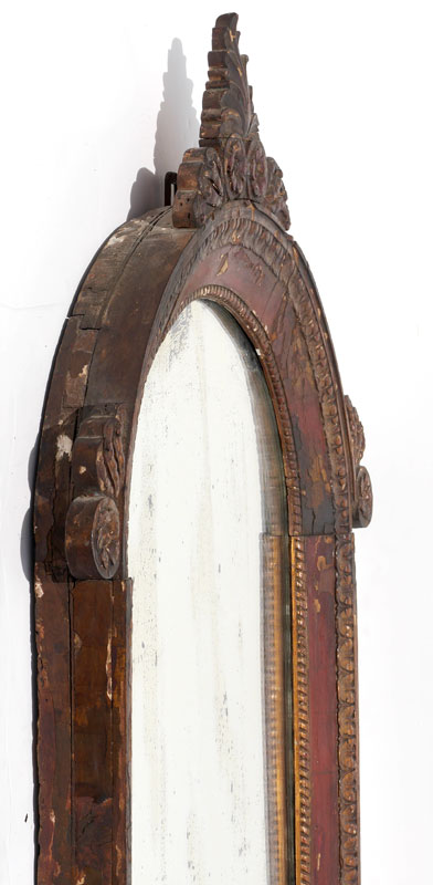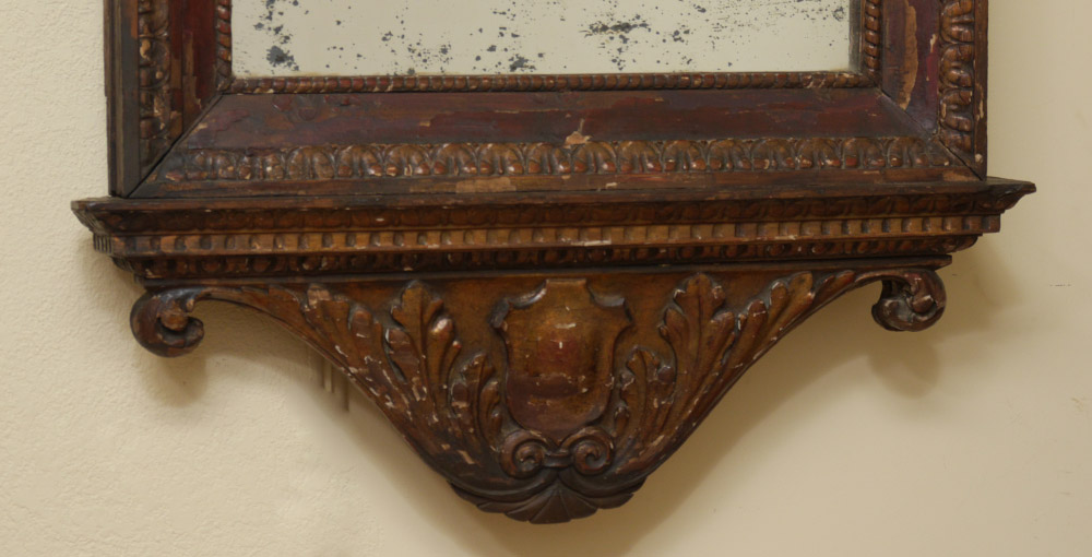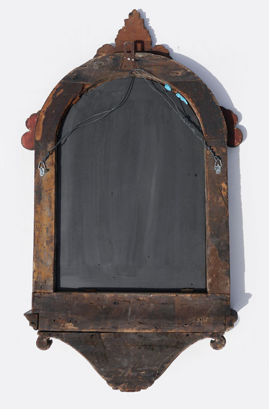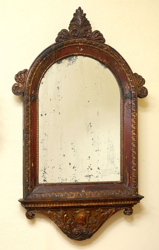 EARLY CARVED PAINT DECORATED ITALIAN MIRROR: Carved wood frame with traces of paint decoration remaining and some loss of veneer. Foliage crest, side decoration, lower crest with shield. Overall measures 56 1/2''h x 33''x 4'' deep.
