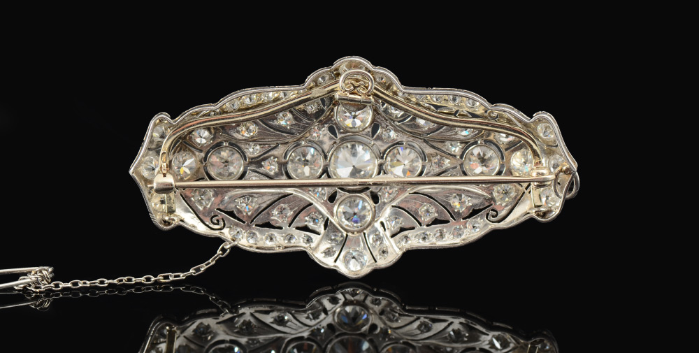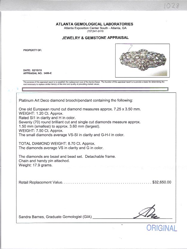 FABULOUS ART DECO PLATINUM DIAMOND BROOCH: Ca. 1925. Converts to a pendant. The central Old European round cut diamond is approx. 1.20 Ct, the remaining diamonds total 8.70 Ct. for a grand total of 8.70 Ct. The diamonds are VS-SI1 clarity and H-H-I color. Bezel and bead set. The frame is detachable. A later pin and safety chain has been added. Measures 2.25'' length. Weight 17.9 grams. Sold with current Florida Diamond Appraisers GIA graduates appraisal for $32,650.