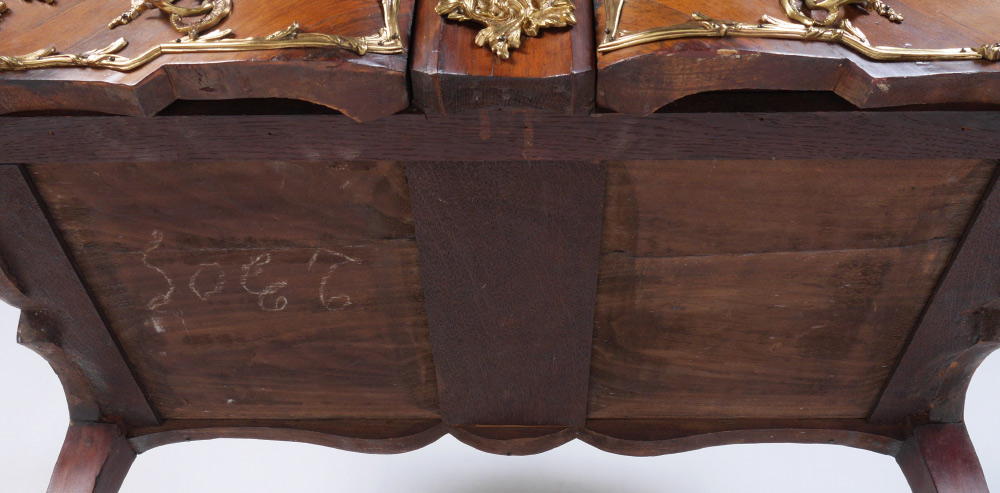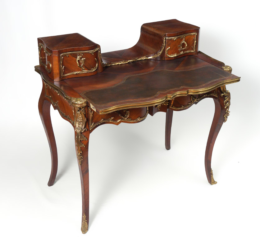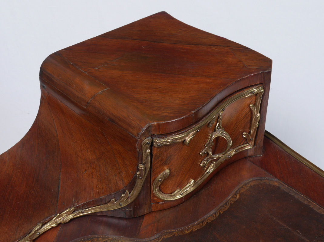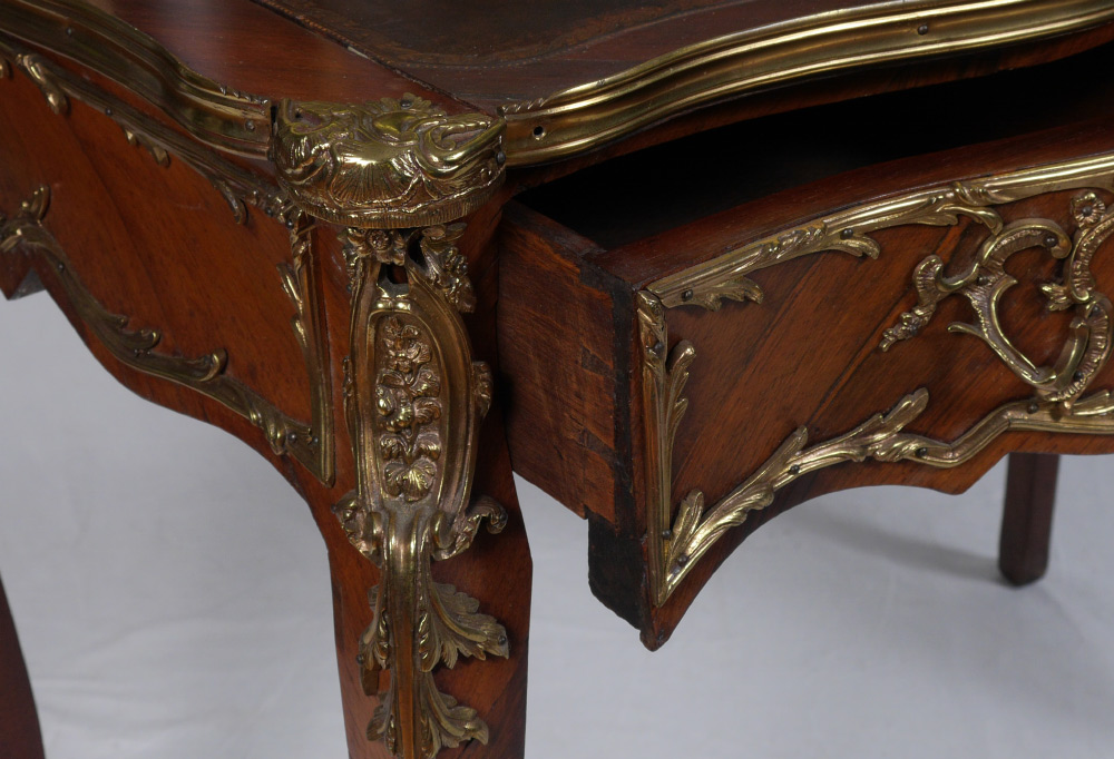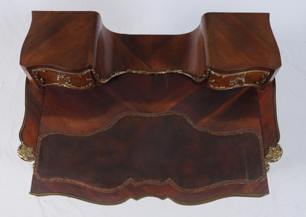 FRENCH ORMOLU MOUNTED WRITING DESK: Shaped top with concave center, drawer either side, inset embossed leather top, brass trim. Shaped skirt with 2 drawers, applied ormolu mounts all over, shaped legs, overall measures 35 1/2'' h. x 36 1/4'' x 22''.