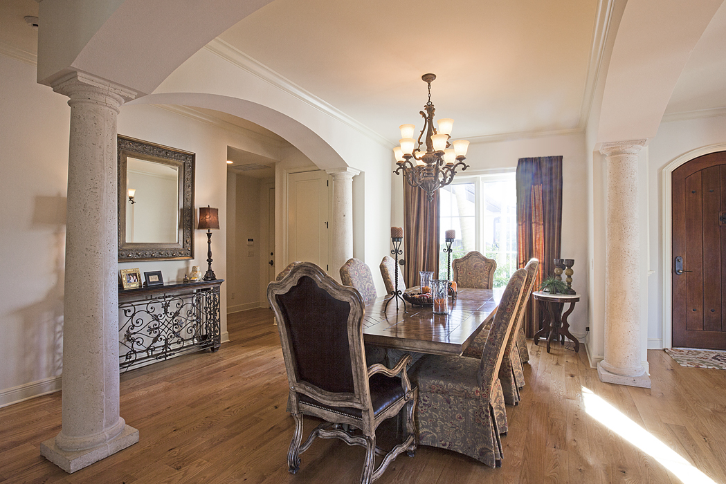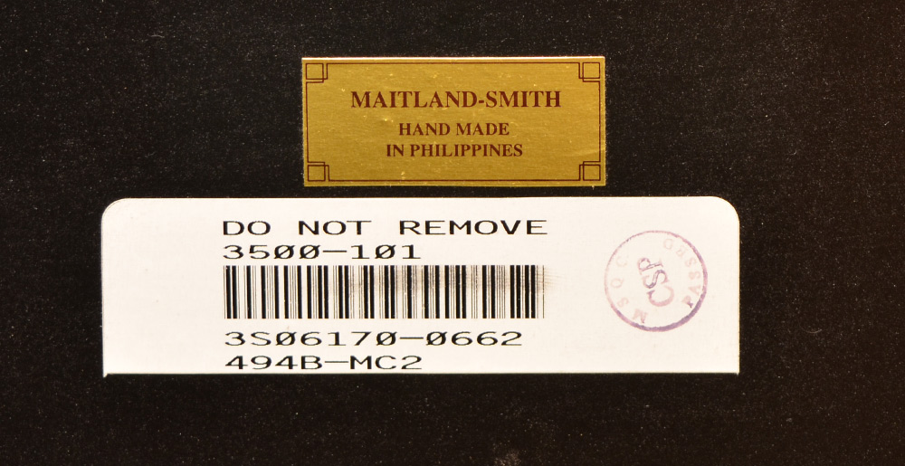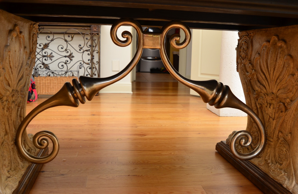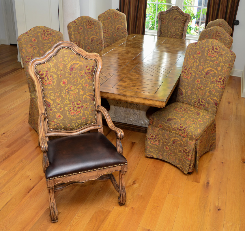 MAITLAND SMITH TABLE & 8 CHAIRS: Rectangular top with carved panels, carved and painted double pedestal base with brushed aluminum supports, Maitland-Smith label under top, measures 32'' h. x 84 1/2'' x 47'', 24'' leaf. Sold with 8 chairs, 2 captains with leather seats and floral upholstered back 49 1/2'' h. x 24 3/4'' x 28'', 6 sides with floral upholstery all over.