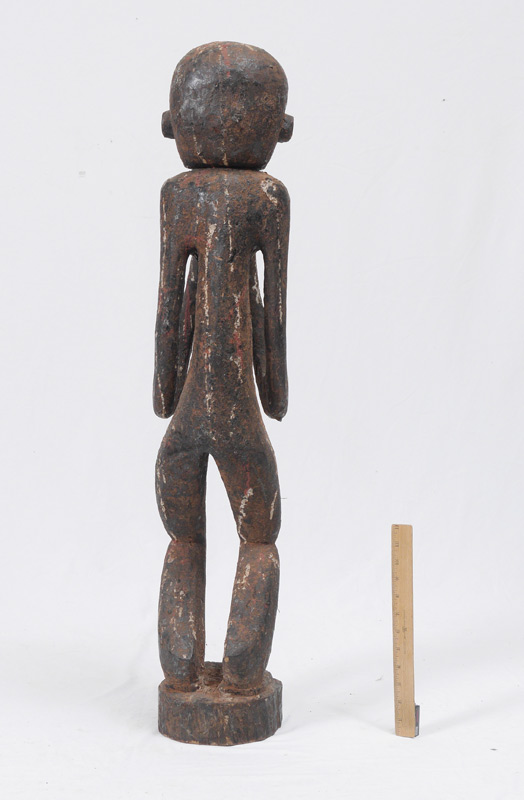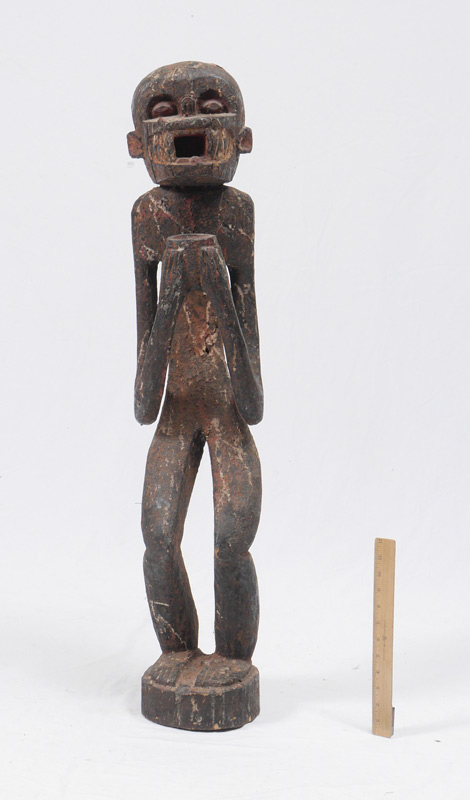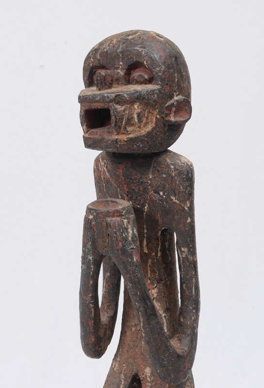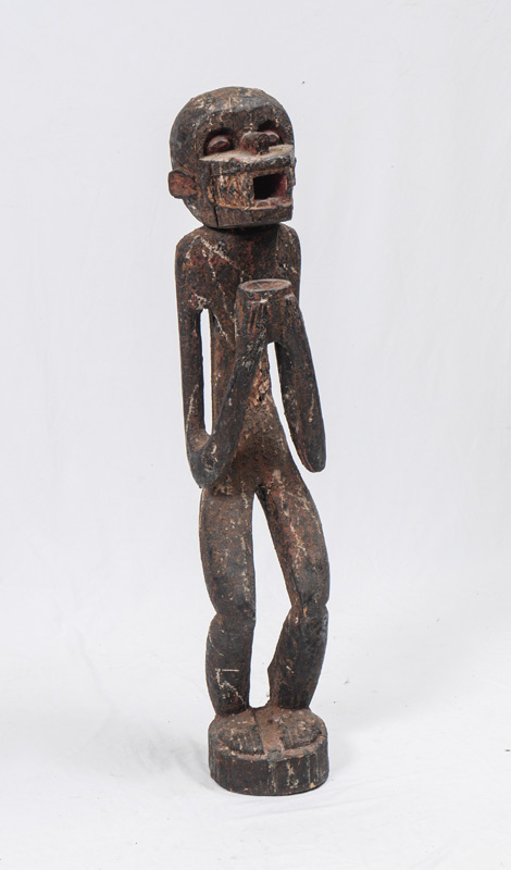 CARVED AFRICAN BAULE MONKEY FIGURE: Ivory Coast, figure of a standing monkey bearing a cup, traces of old paint decoration. 39 1/2'' h. x 8'' x 8''.