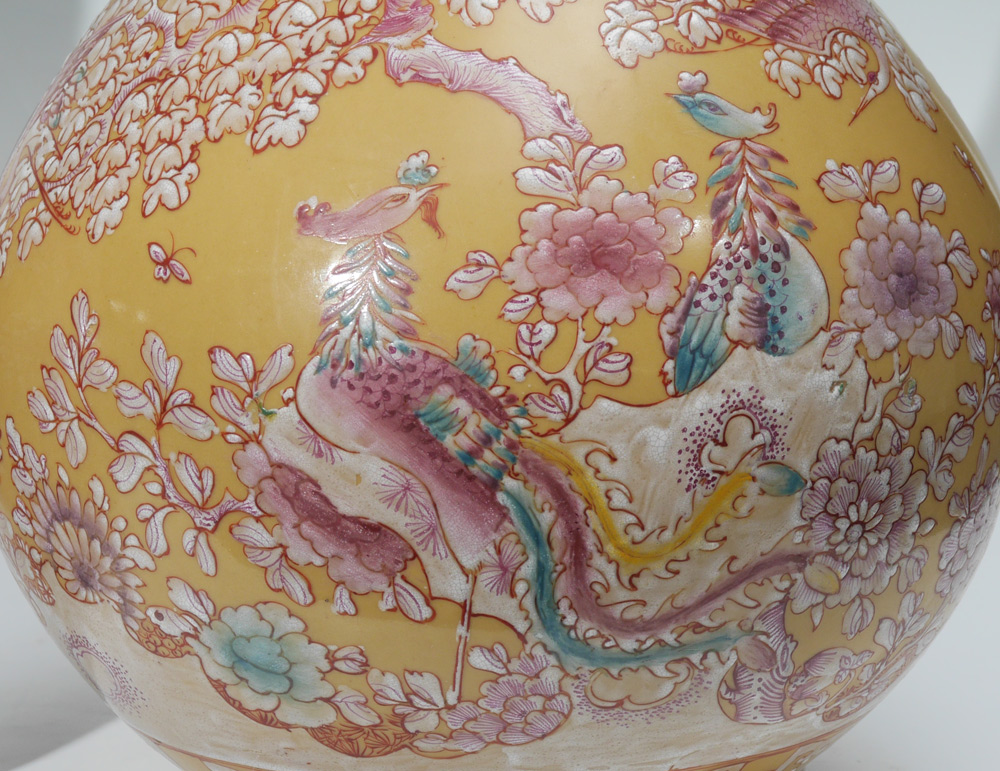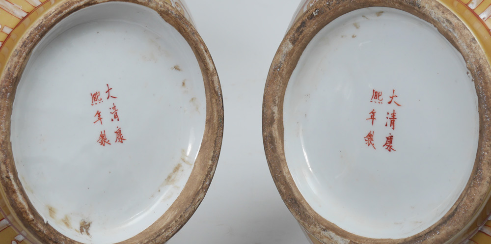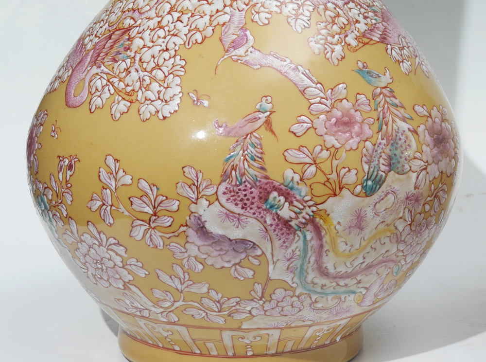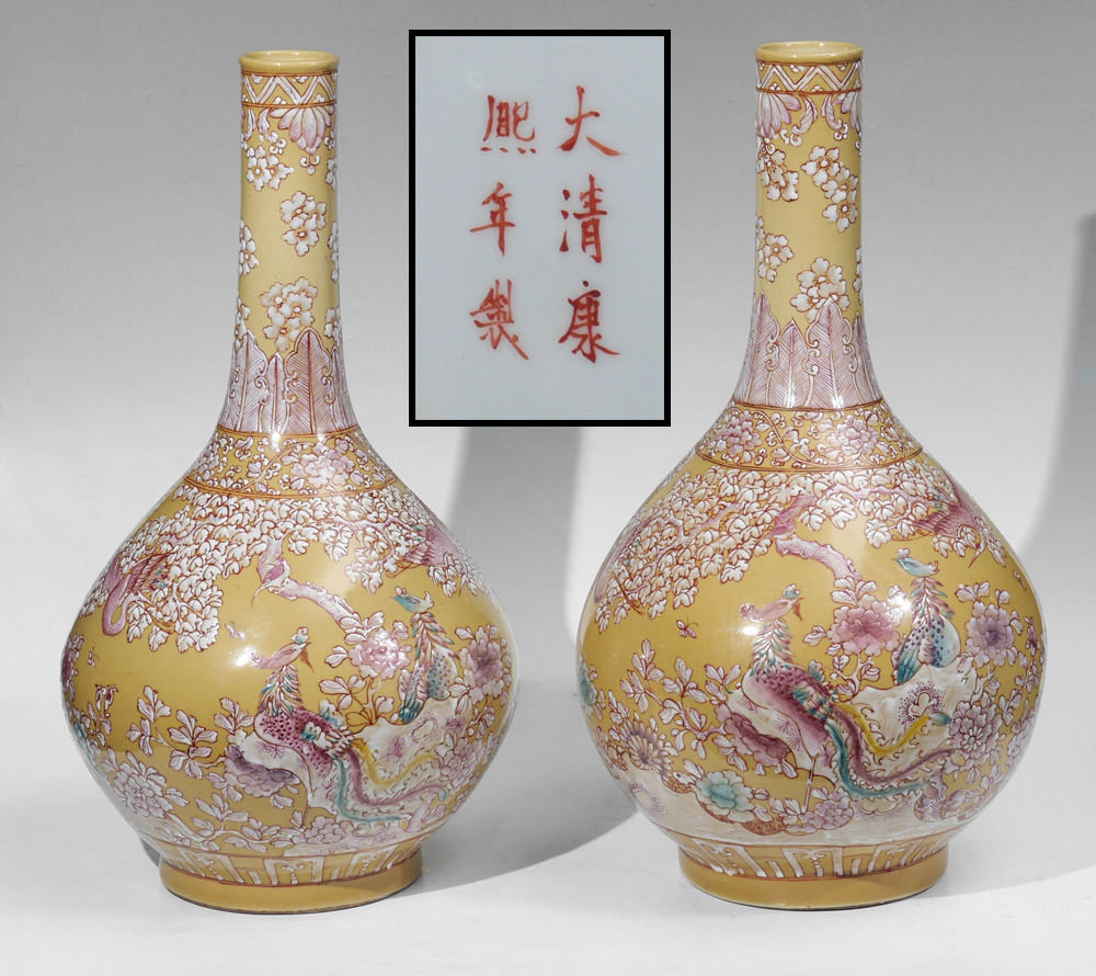 PAIR LARGE CHINESE KANGXI MARKED VASES: Pear form with long neck, mustard ground with enamel foliate, birds and insect decoration. Marked on footed base with red Kangxi mark, 25 1/4'' h. x 14''.