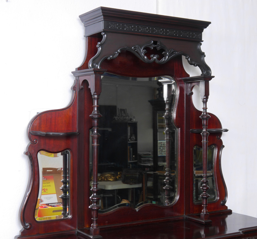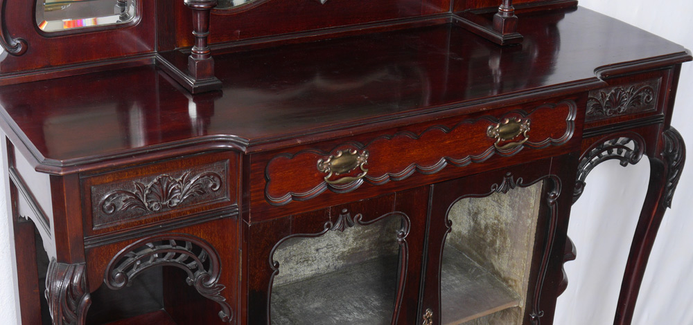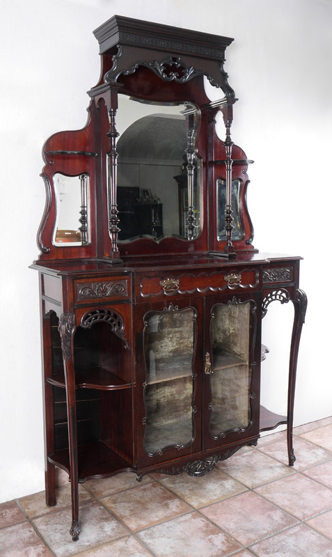 LATE VICTORIAN MAHOGANY MIRROR BACK ETAGERE: 2 section etagere, the top half having three shaped double beveled mirrors under a valence scroll carved pediment. Lower half having a velvet lined two door chocolate cabinet flanked by shaped open shelves. This elegant piece is supported in the front by two acanthus leaf carved cabriole legs that end in a classic scroll carved foot. 78''h x 48''w x 15''d.