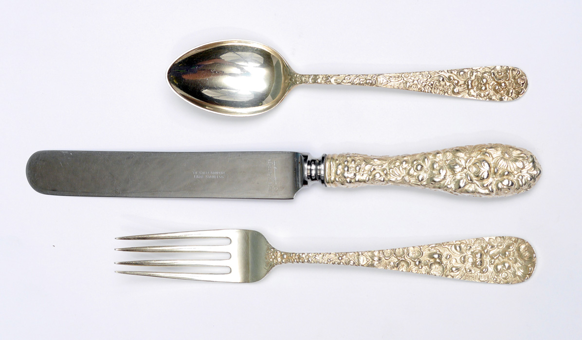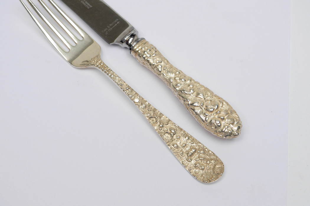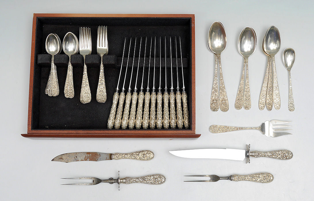 STIEFF ROSE STERLING FLATWARE SERVICE: Approx. 53 pieces in the Stieff Rose pattern to include 11 forks (6 7/8''), 7 spoons (5 7/8''), 7 spoons (5 1/2''), 4 spoons (5 1/2''), 12 hollow knives (8 3/4''), 5 table spoons (7 3/4''), 2 serving spoons (8 1/2''), serving fork (7 5/8''), sugar scoop (6''), hollow carving set (fork 9 3/4'', fork 8 1/4'', knife 11 1/2''), hollow master fish knife (9 1/2''). Approx. 62.5 troy oz.