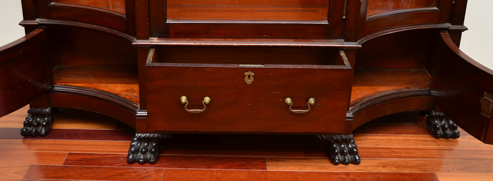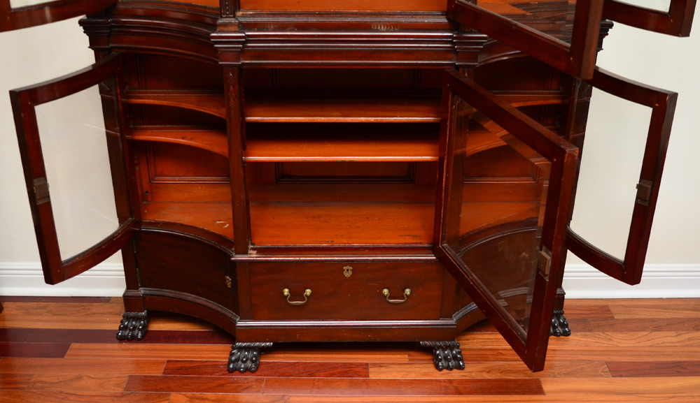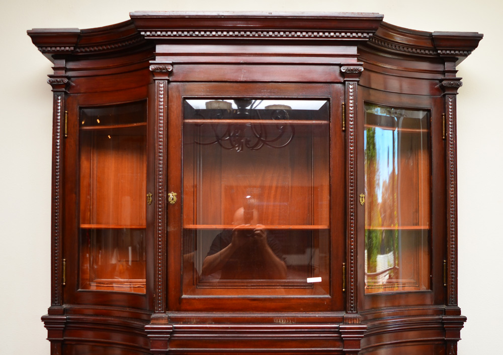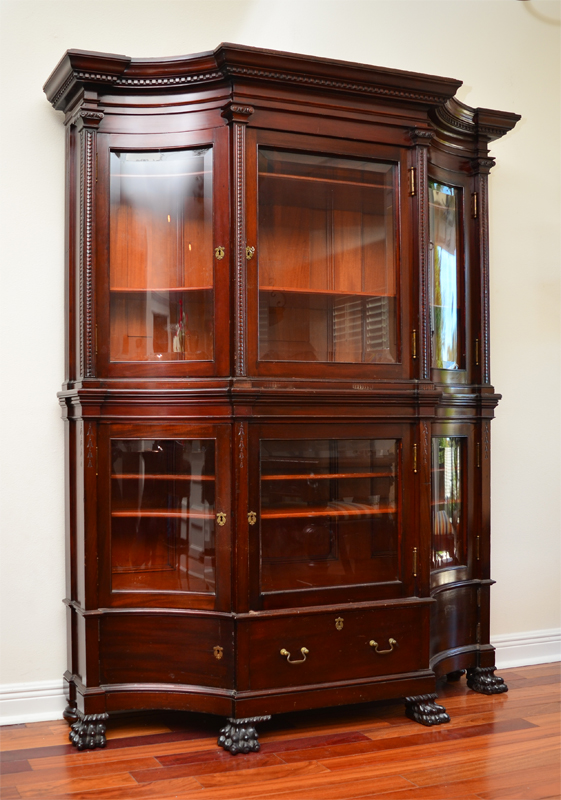CONCAVE GLASS MAHOGANY CURIO CABINET: Shaped pediment with dentil molding, carved square column stiles, beveled 3 glass doors. Base with 3 beveled glass doors over central doors and 2 blind doors, carved front paw feet. 4 wood shelves, overall measures 78 1/2'' h. x 60'' x 16 1/2''.