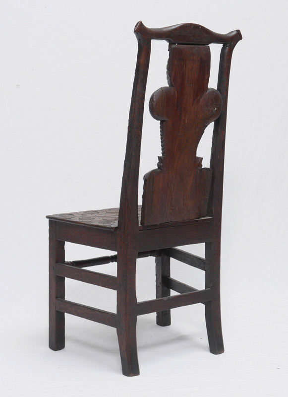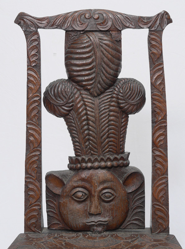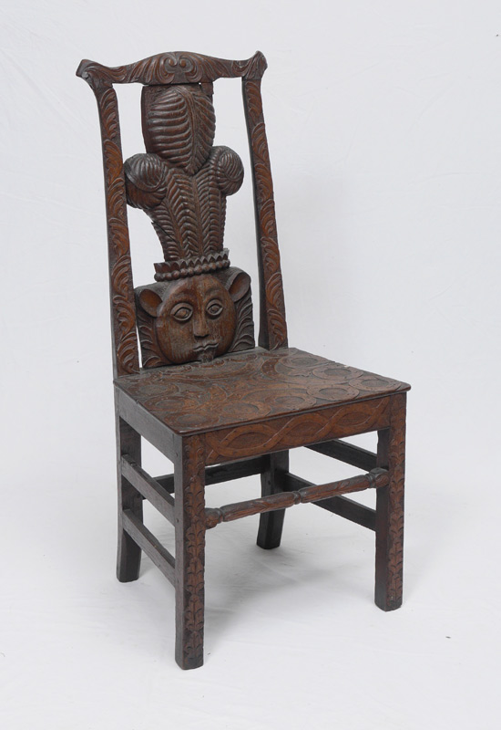 EARLY CONTINENTAL CARVED FIGURAL CHAIR: Top rail and sides with foliate motifs, back splat with carved face and plumed headpiece design. Seat top and front legs with stylized oak leaf and vines, turned front stretcher. Pegged construction, overall measures 40 1/4'' h. x 19 1/2'' x 17''.