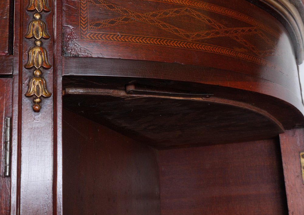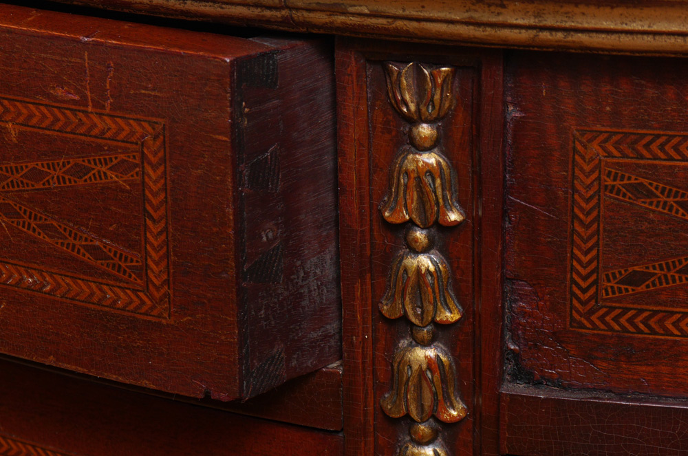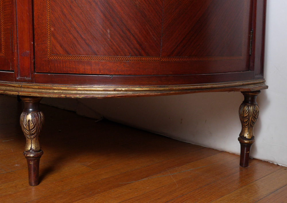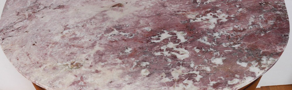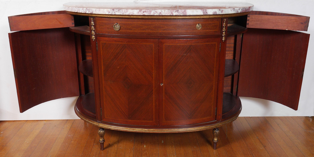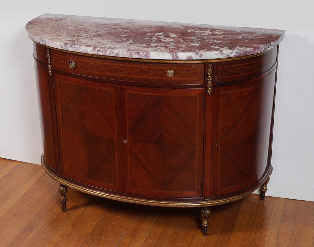 MARBLE TOP DEMI CHEST COMMODE: Amethyst variegated marble top. Center drawer over 2 doors, curved sides with hidden swing drawer over single door. Parquetry and string inlay on panels, carved gilt decoration on frame, all on 4 petite carved legs. Overall measures 38'' h. x 52'' x 23 1/4''.