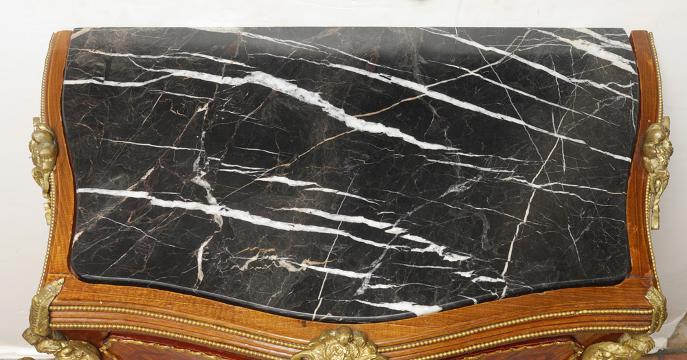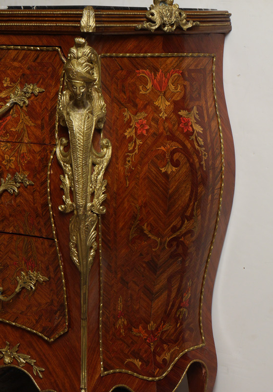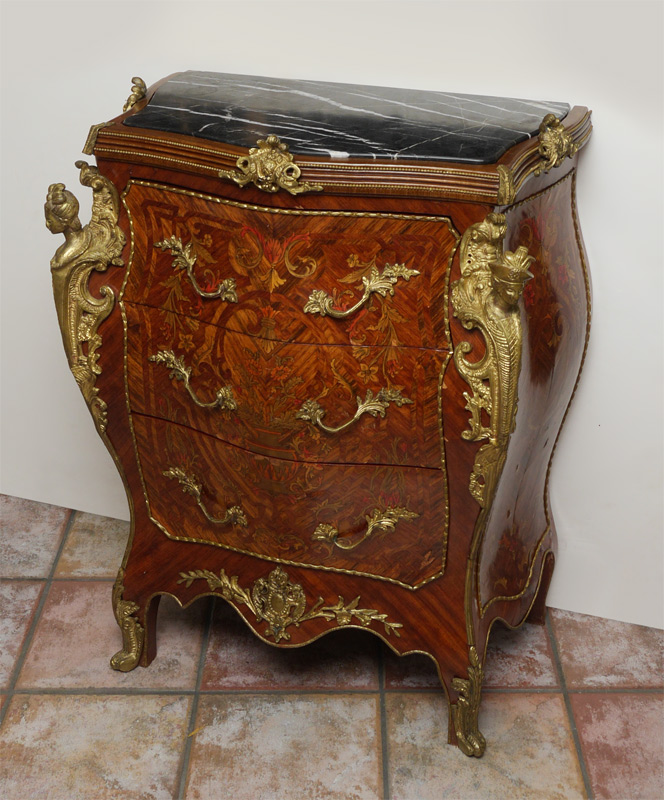 3 DRAWER MARQUETRY INLAID MARBLE TOP COMMODE: Inset variegated black marble top, bombe 3 drawer base profusely inlaid with urn, floral and geometric designs. Applied figural ormolu decoration at corners, trim and handles. Overall measures 38 3/4'' x 31'' x 18 1/2''.