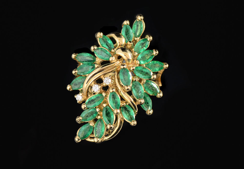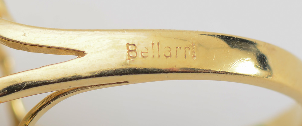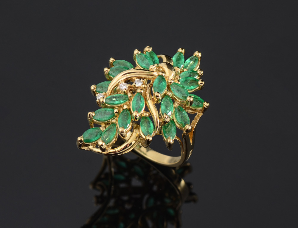 BELLARRI EMERALD & DIAMOND RING: 14K yellow gold ring contains 3 round full cut diamonds. totaling approx. .03 Ct., SI in clarity and H-I in color. The 22 marquise faceted emeralds total approx. 2.25 Ct., averaging VS-SI in clarity, G in Hue, 4 in Tone and 3 in Saturation. Gold weight: 8.5 grams. Size: 6.5 Signed Bellarri.