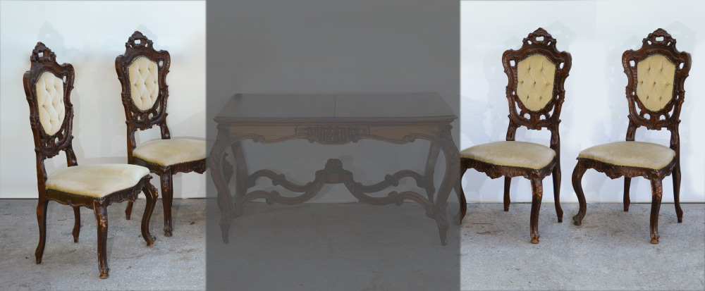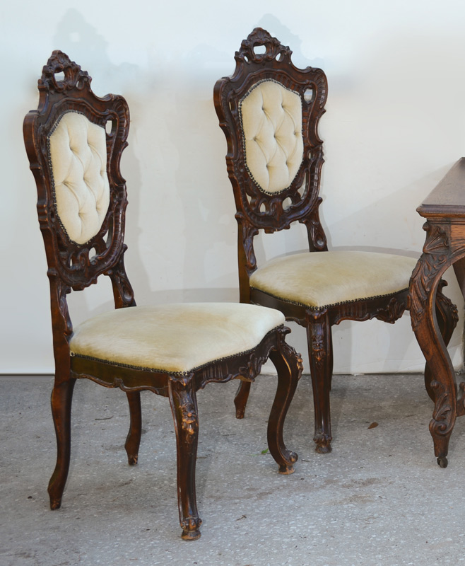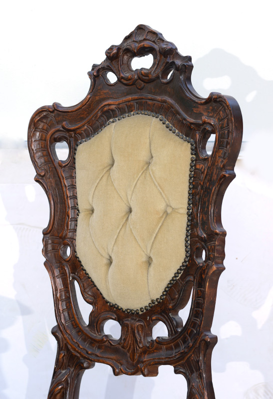 4 PIERCED CARVED SIDE CHAIRS: Rococo style carved and pierced foliate scroll backs with tufted upholstery, carved and shaped rails and feet, overall measures 47 3/4'' h. x 24'' x 21''.