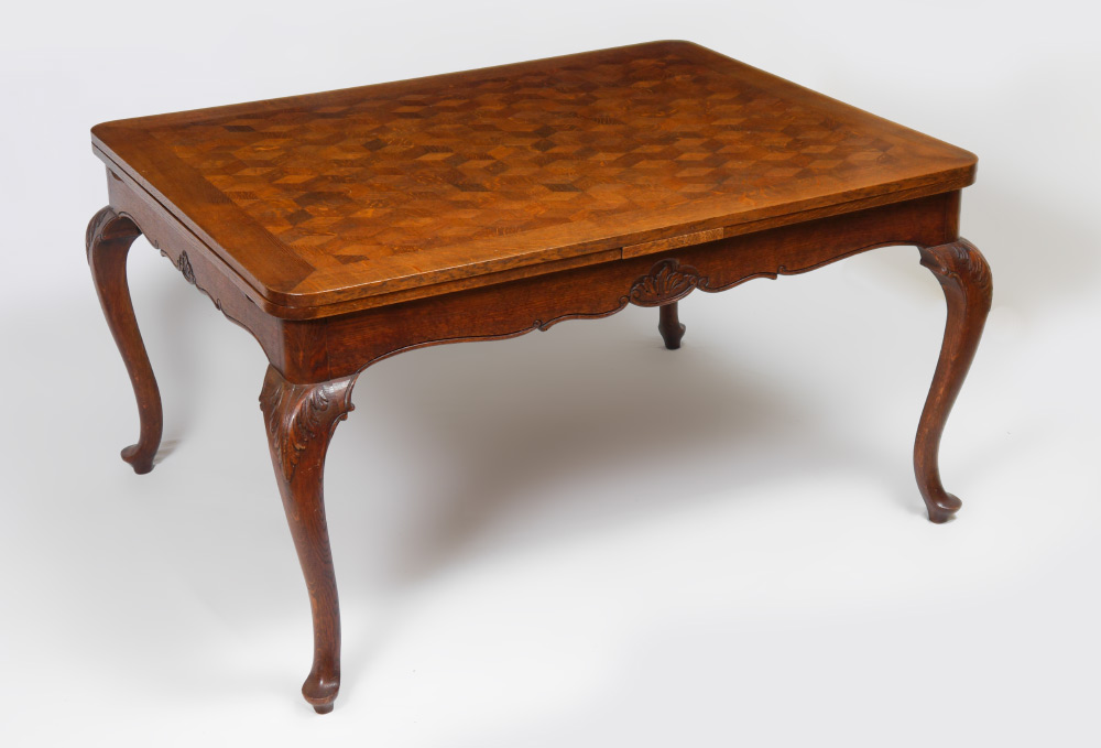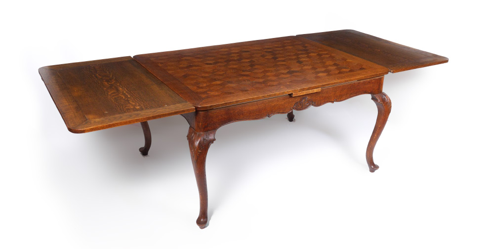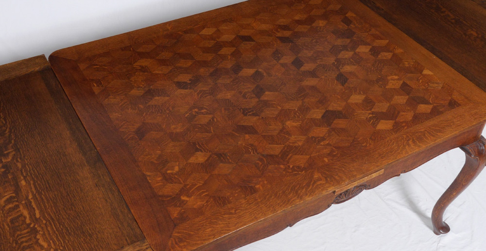 COUNTRY FRENCH OAK PARQUETRY EXTENSION DINING TABLE: Block parquetry top, carved skirt and cabriolet legs. Measures approx. 30'' h. x 44'' x 56'', the pull out extension leaves add 23'' to each end.