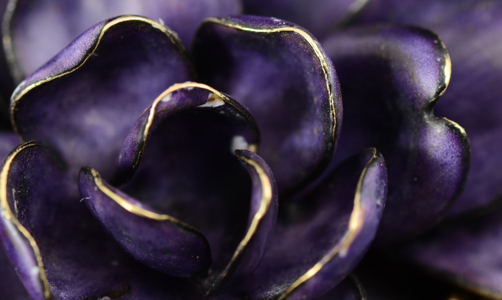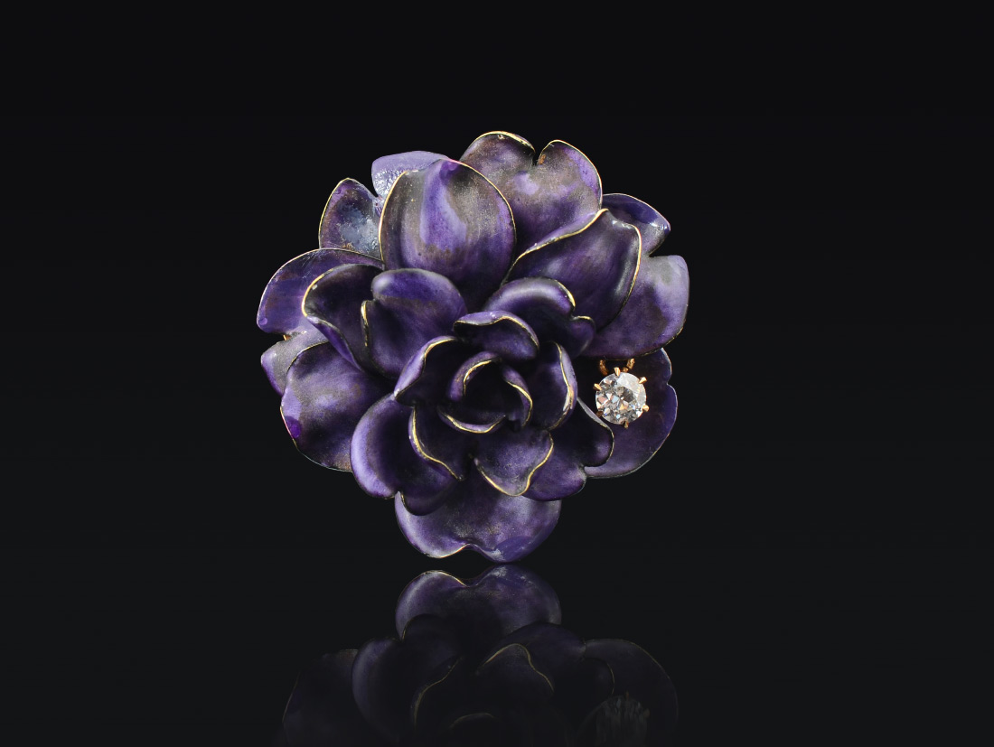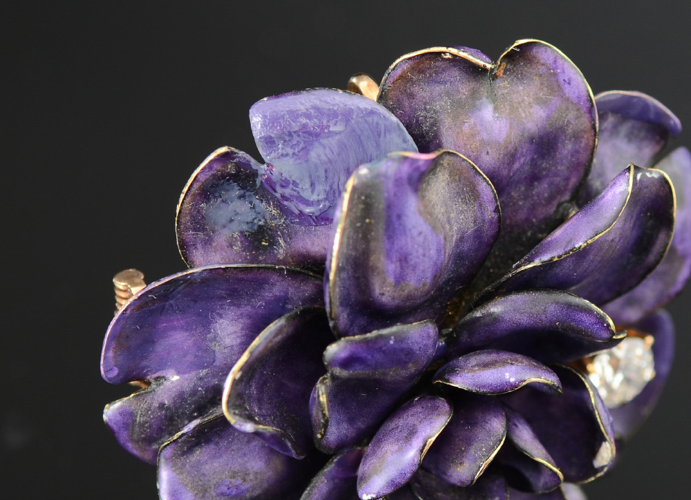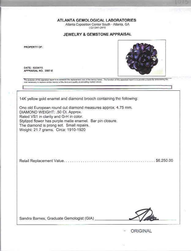 BELLE EPOQUE ENAMELED GOLD AND DIAMOND BROOCH: Ca. 1910-1920. Deep purple enameled flower with a .50 Ct Old European round cut diamond quivering from a petal. The diamond is rated VS1 clarity and G-H color. Bar pin closure. Measures 1.50'' dia. Weight 21.7 grams. Sold with current Atlanta Gemological GIA graduate's appraisal for $6250.
