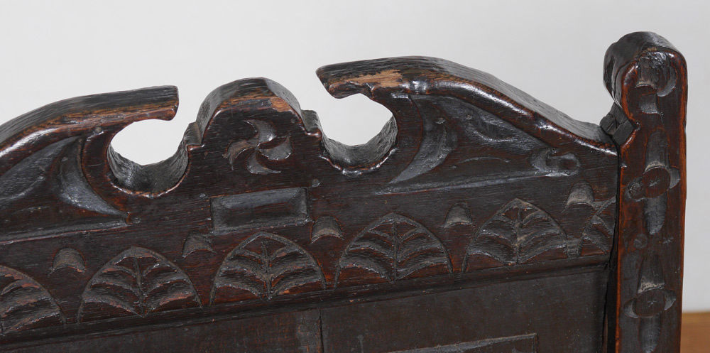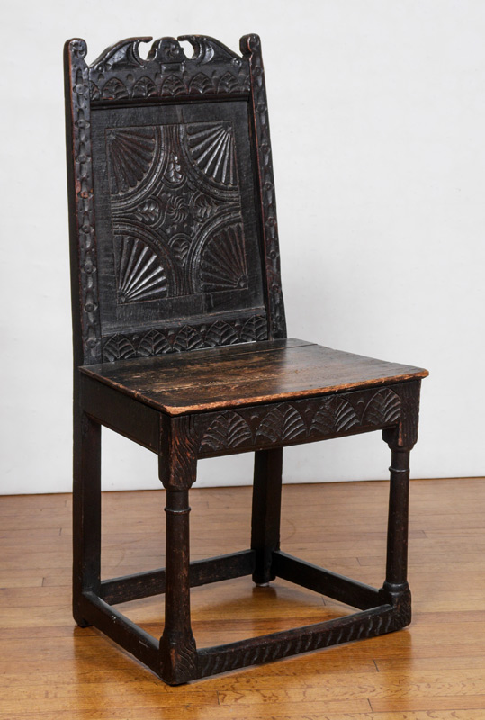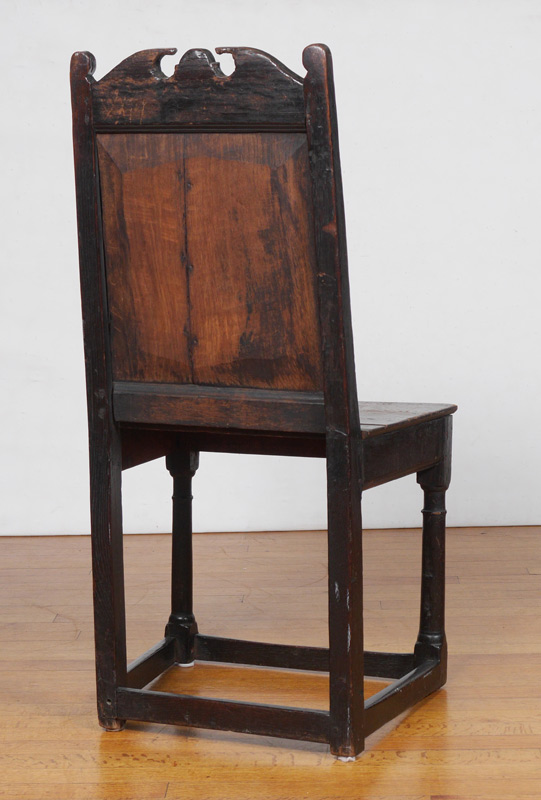 EARLY ENGLISH CARVED OAK SIDE CHAIR: Believed to be Charles I, note the stretchers at floor level, pegged construction. Said to have come from ''God's Providence House'' an inn and stage coach a days journey from London. The chairs were brought to the US in the 1800's. Overall measures 39 1/2'' h. x 20'' x 17''.