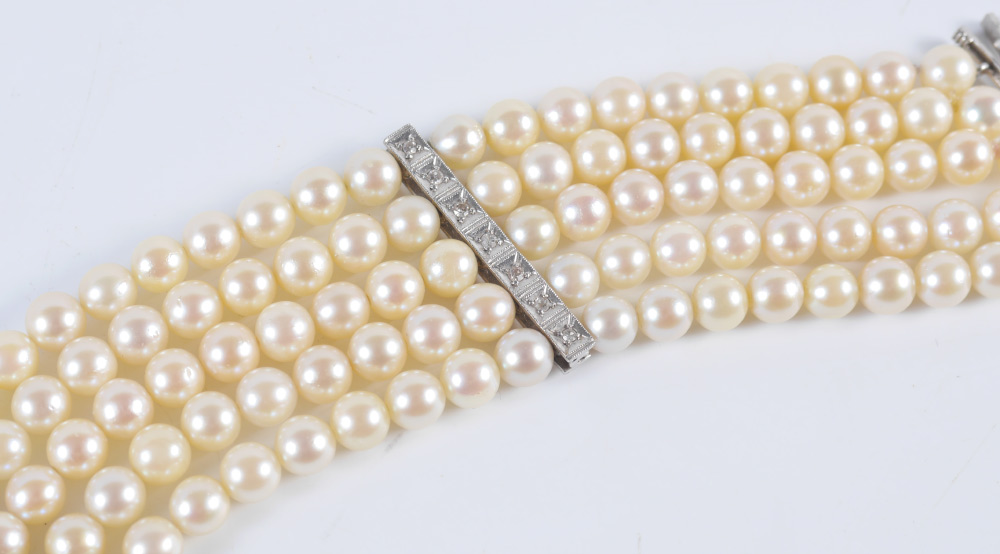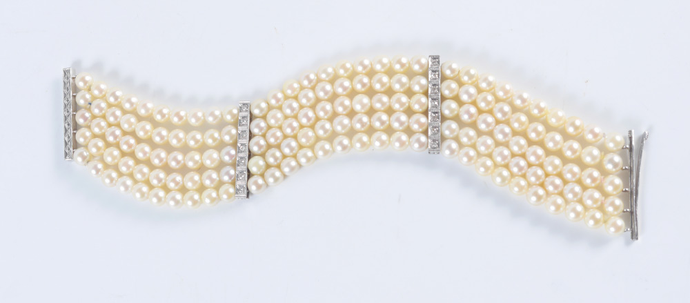 PLATINUM PEARL 5 STRAND BRACELET: Five strands of 5.50 mm cultured pearls, dark cream in color with medium/high luster, with platinum spacers and clasp containing 14 round single cut diamonds. totaling approx. .10 Ct., VS in clarity and G-H in color. The diamonds are bead set. Platinum weight: 12.0 grams approx. Length: 7.5'' Width: 1.25''.