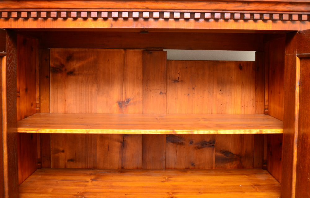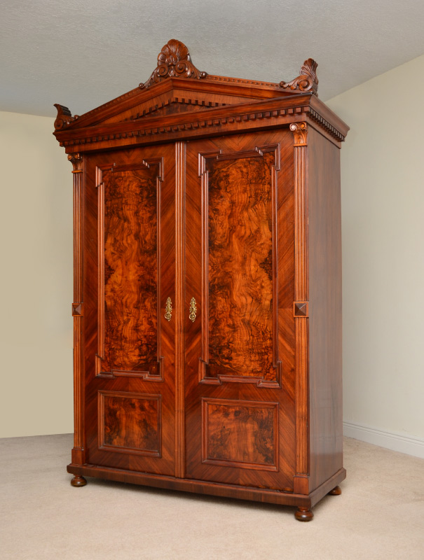 HIGH VICTORIAN CARVED LINEN PRESS: A match to the previous lot 1093, carved crest with shell and foliate scroll over dentil molding, 2 doors with burl veneer in panels 4 wood shelf interior, on bun feet. 84 1/2'' h. x 53'' x 23 1/2''