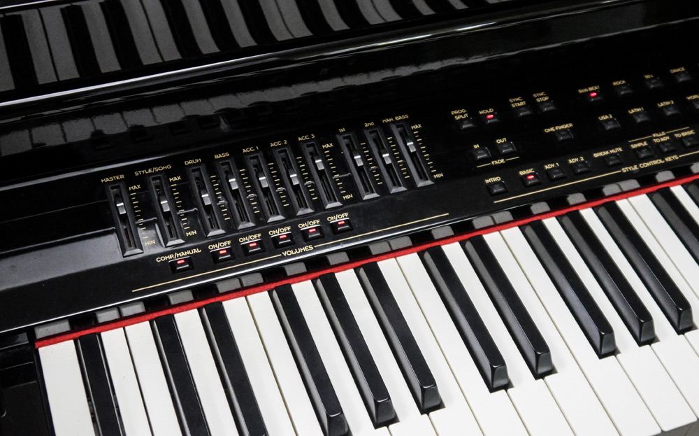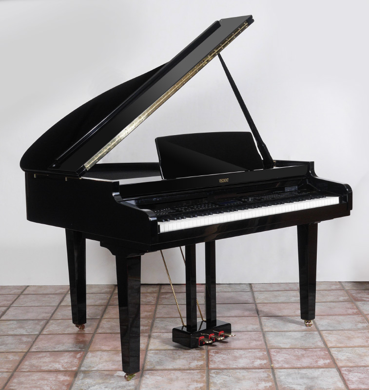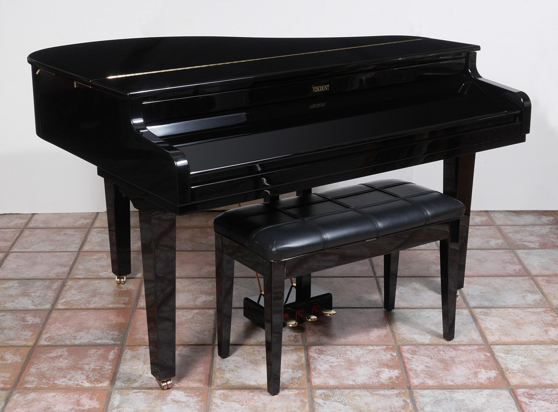 VISCOUNT BLACK LACQUER DIGITAL PETITE BABY GRAND PIANO: Black lacquer case by Viscount with Grand X6 standard digital keyboard, overall measures 37'' h. x 54 1/2'' x 47''. Sold with matching bench, 20 1/2'' x 30'' x 15 1/2''.