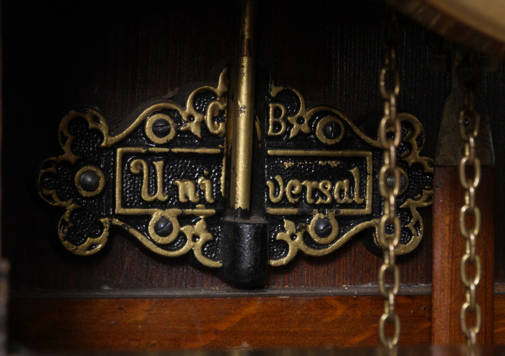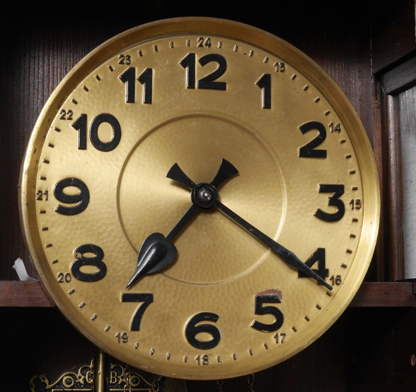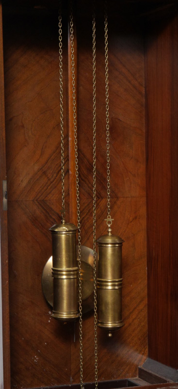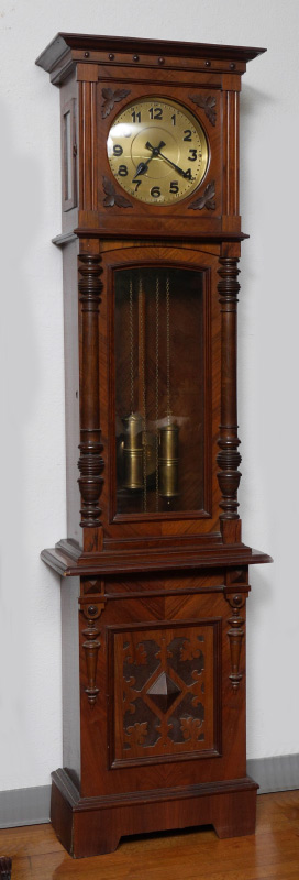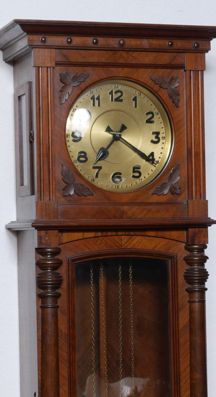 GUSTAV BECKER GERMAN GRANDFATHER CLOCK: Case with carved applied decoration, top door with bowed round window over shaped glass window door, applied turned half columns, base with carved and applied decoration. Brass dial with Arabic numerals, Gustav Becker marked weight driven time and strike movement. Overall measures 77 1/2'' h. x 21 1/2'' x 11 3/4''.