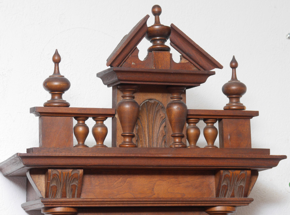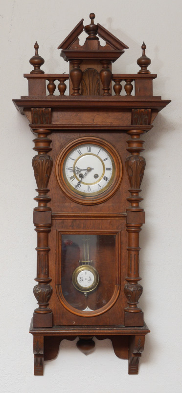 CARVED GERMAN WALL CLOCK: Removable architectural pediment with spire finial, walnut case with carved and turned half columns, shaped lower window. Porcelain dial with Roman numerals, unmarked key wind time and strike movement. Overall measures approx. 41'' h. x 16 1/4'' x 7 1/2''.