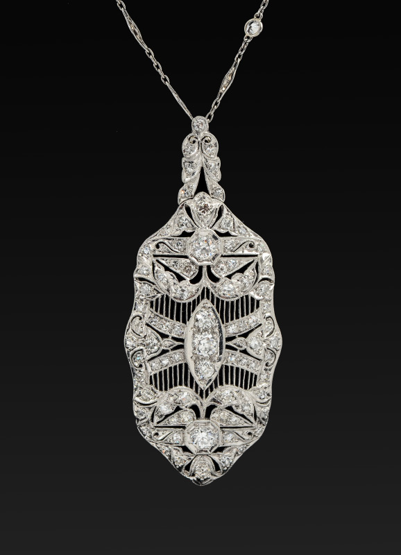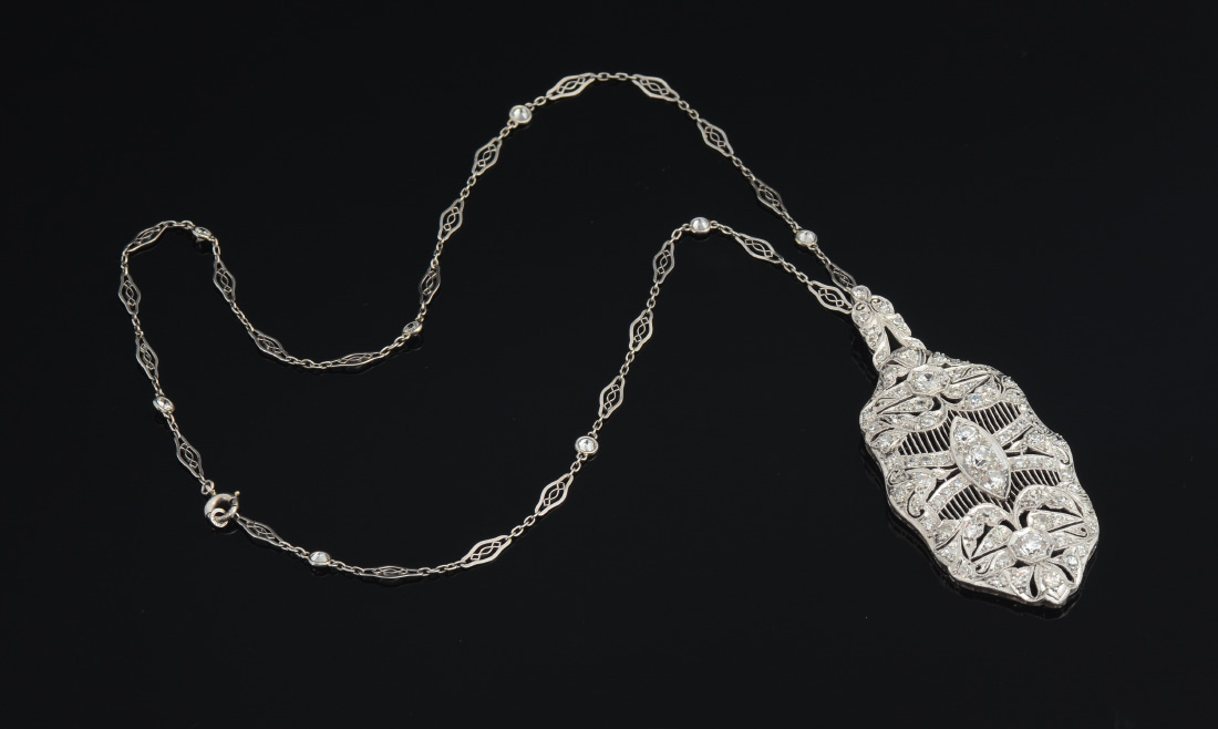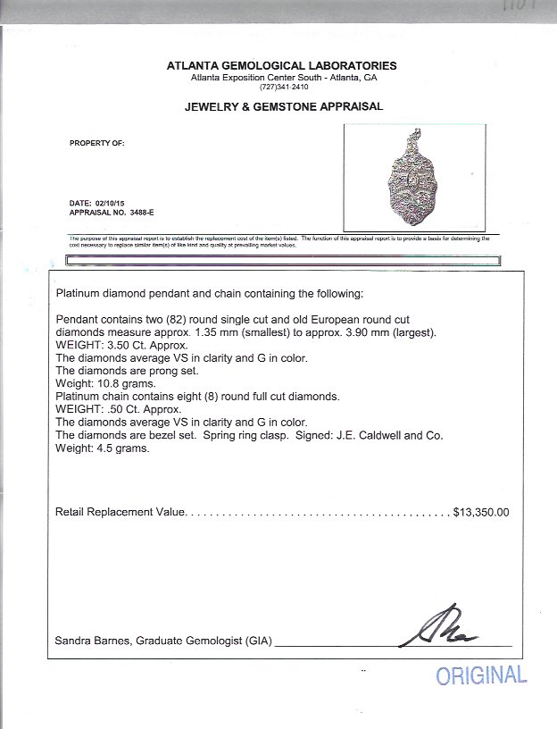 J.E. CALDWELL PLATINUM 4.00 CTW DIAMOND PENDANT NECKLACE: Show stopping platinum pendant of the finest filigree work. The 82 round single cut diamonds total approx. 3.50 Ct., with the largest being 3.90 mm. The clarity is rated VS and color G. The 18'' platinum open work chain has 8 round full cut diamonds totaling .50 Ct., also rated VS and G. Pendant measures 2.5''L. Weight 4.5 grams. Sold with current Atlanta Gemological GIA graduate's appraisal for $13,350.