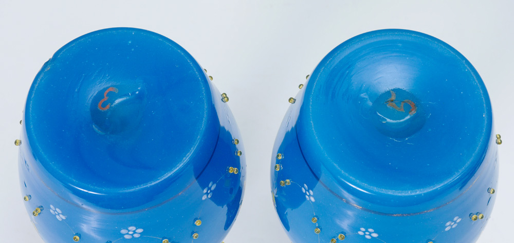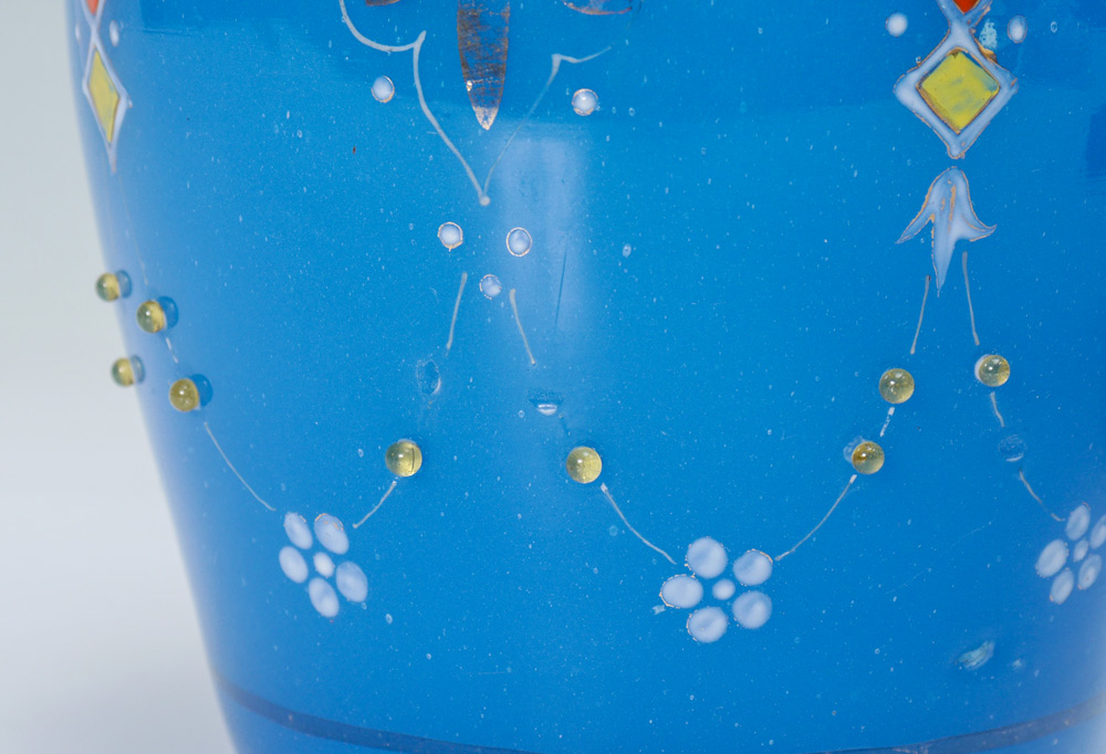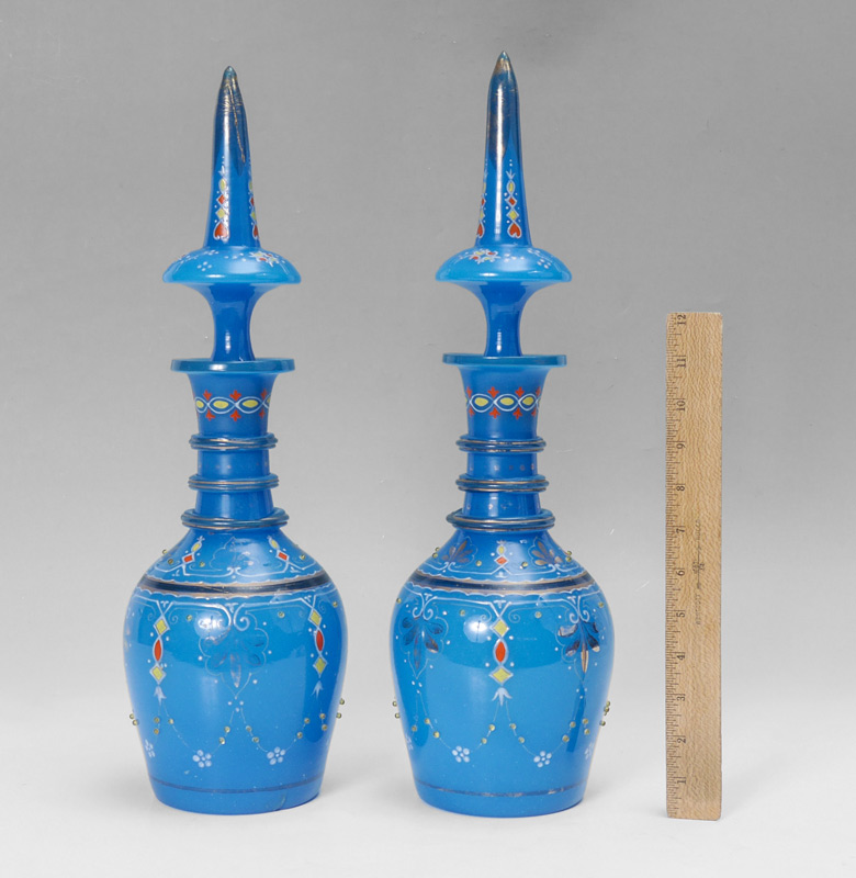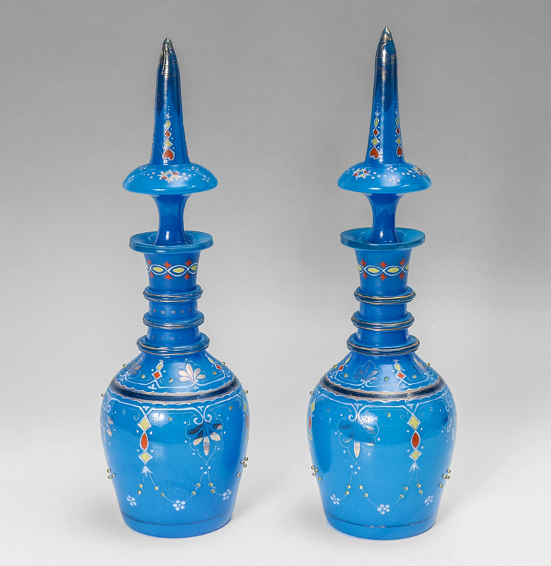 PAIR BOHEMIAN OTTOMAN STYLE GLASS DECANTERS: Blue opaline glass with polychrome enamel and gilt decoration, applied glass beads. No makers mark, overall measures 18 1/2'' h. x 5 1/2''.