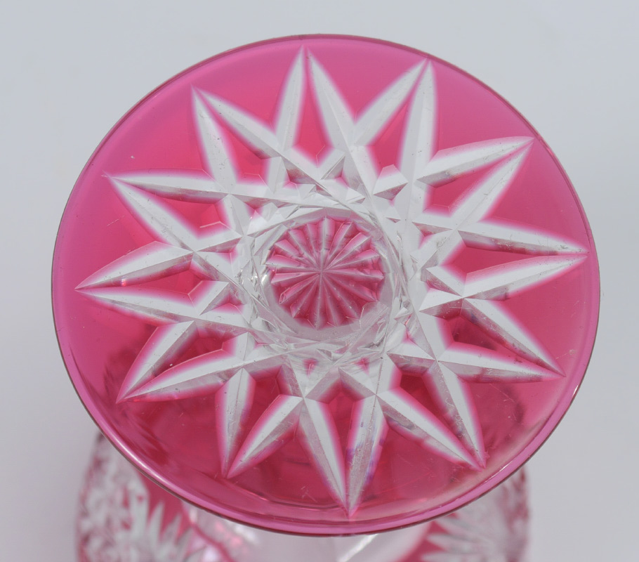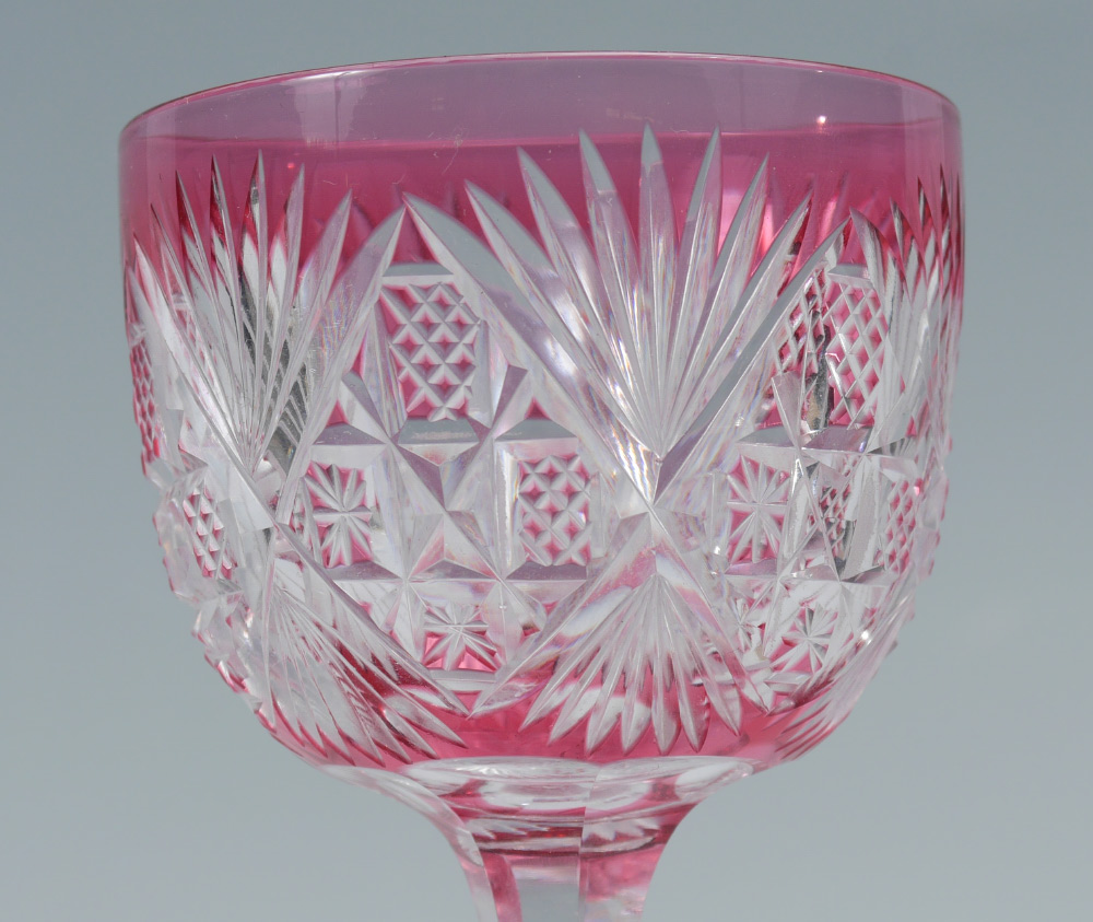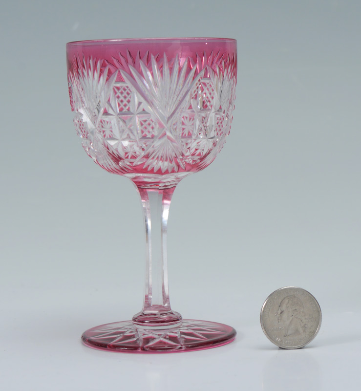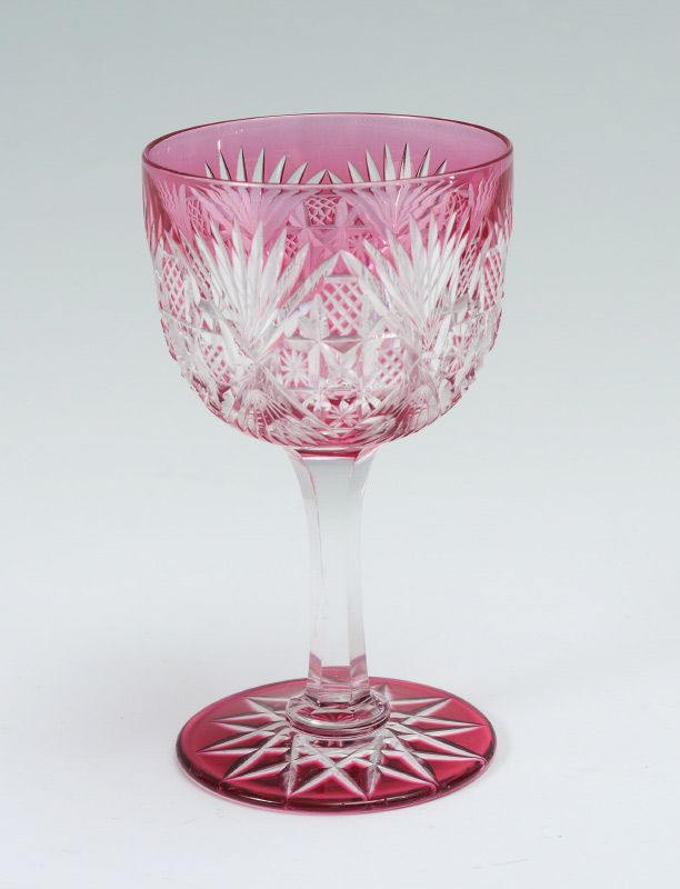 DORFLINGER PALE CRANBERRY ROYAL PATTERN CUT GLASS WINE: Rare Pale Cranberry cut to clear in the Royal Pattern. Approx. 4 5/8''h