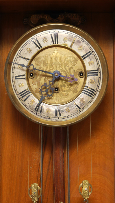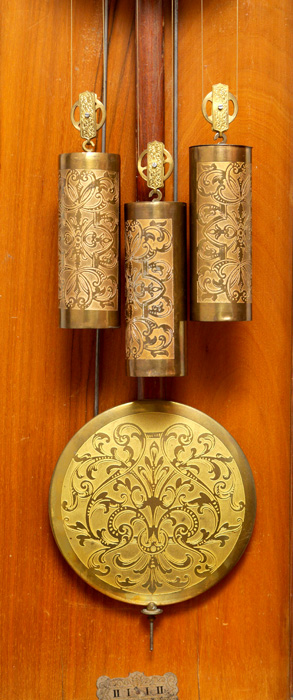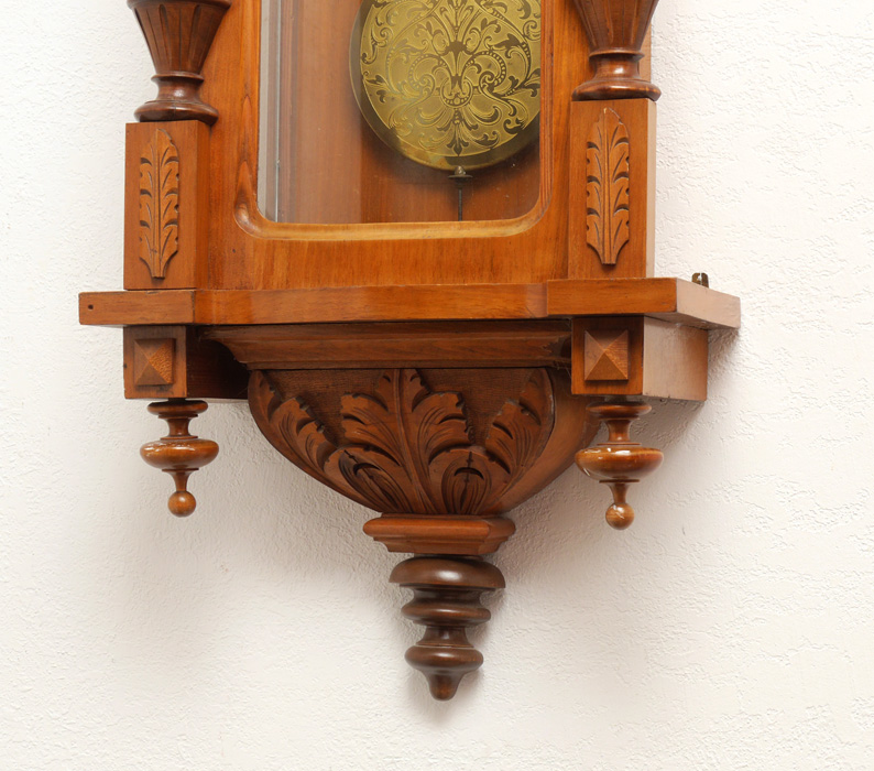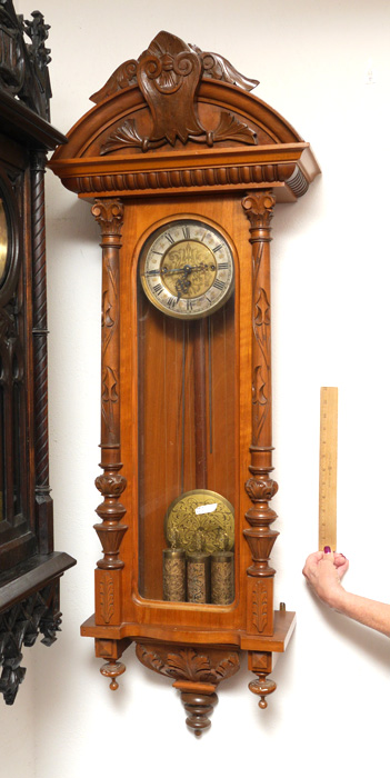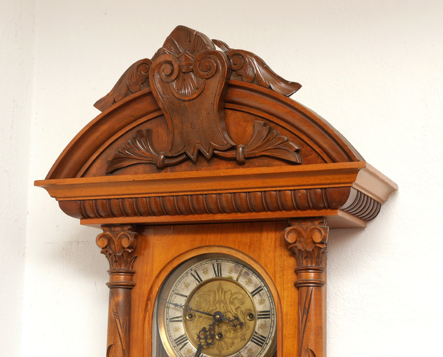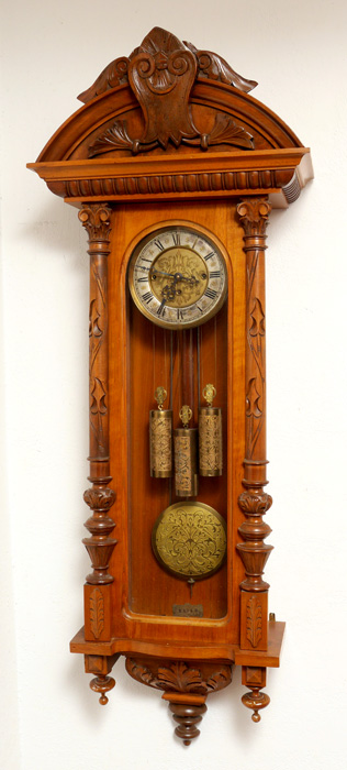 GUSTAV BECKER TRIPLE WEIGHT REGULATOR CLOCK: Arched pediment with applied carved decoration, door with carved half columns, lower oak design finial. Silvered and embossed dial with Roman numerals, Gustav Becker marked time and strike movement. Embossed triple weights and pendulum bob, 50'' h. x 18 1/2'' x 9 1/2''.