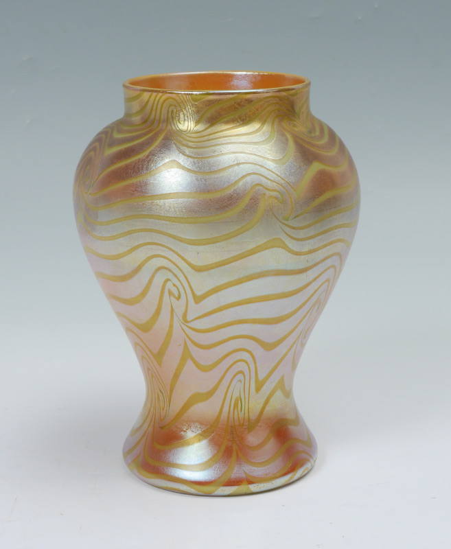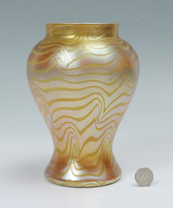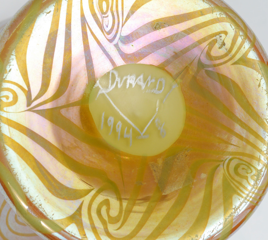 VICTOR DURAND GOLD KING TUT SIGNED ART GLASS VASE: Gold color iridescent glass, measures 8''h, signed Durand 1994-8.