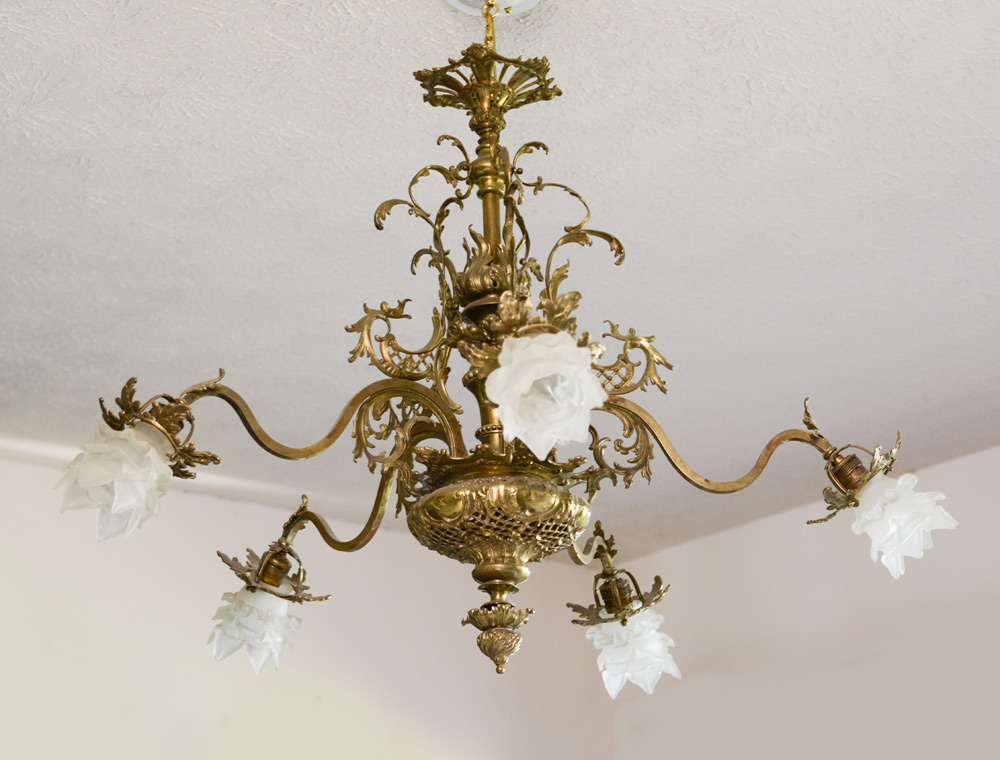 5 LIGHT BRASS ROCOCO CHANDELIER: Rococo style frame with foliate and scroll motif, 5 shaped arms with floriform frosted glass shades. Overall measures approx. 28 1/4'' h. x 37''