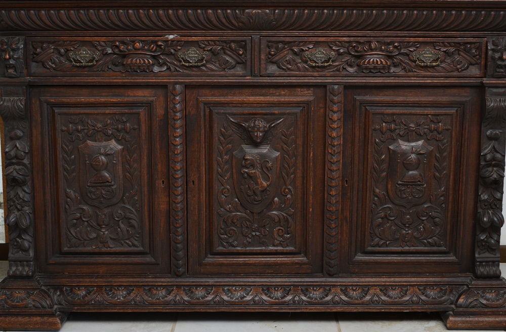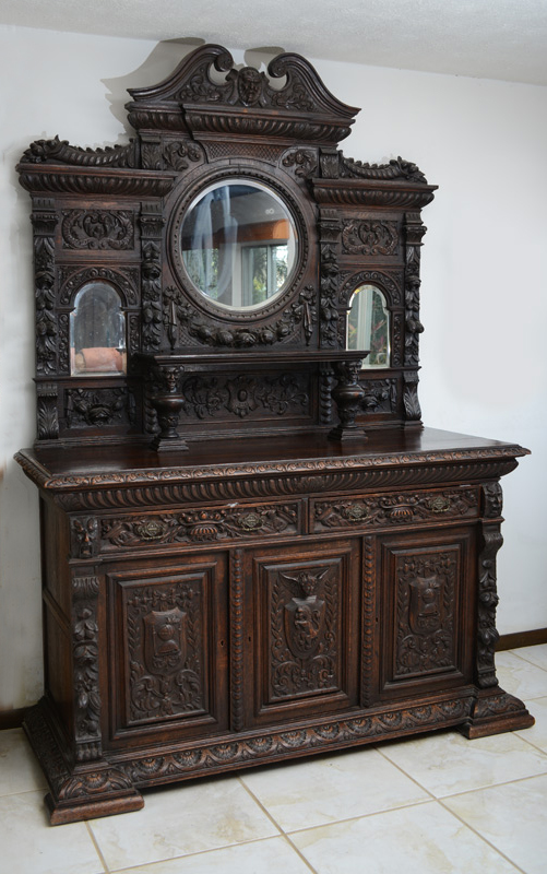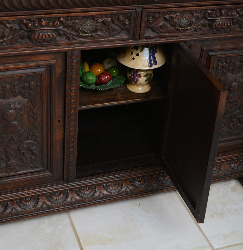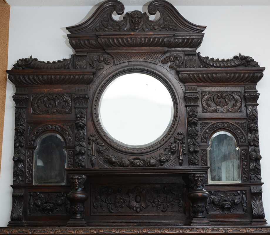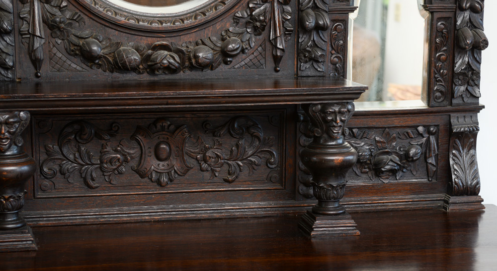 LARGE BELGIAN CARVED OAK STEPBACK CUPBOARD / SIDEBOARD: Masqueron carved scrolled pediment over a tall backsplash with three beveled glass mirrors and adorned with deep carvings depicting the bounties of life, fish, fruits, cornucopia, and floral wreaths. Lower three door cabinet with carved drawers over three doors with heraldic shields. One of the best we've seen. Approx. 89''h. x 68''w. x 25.5''d. overall.