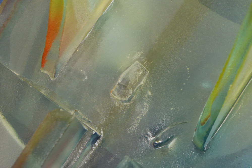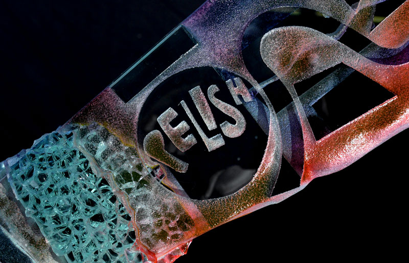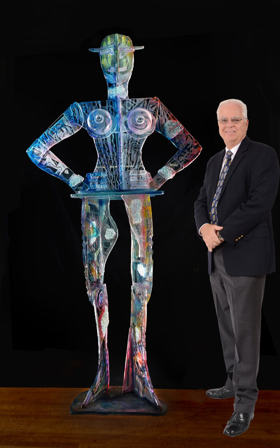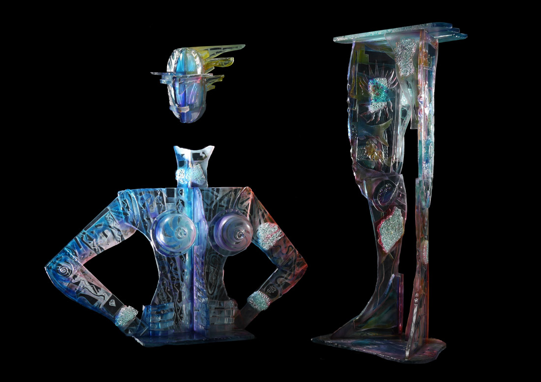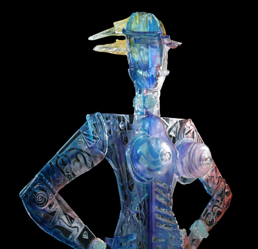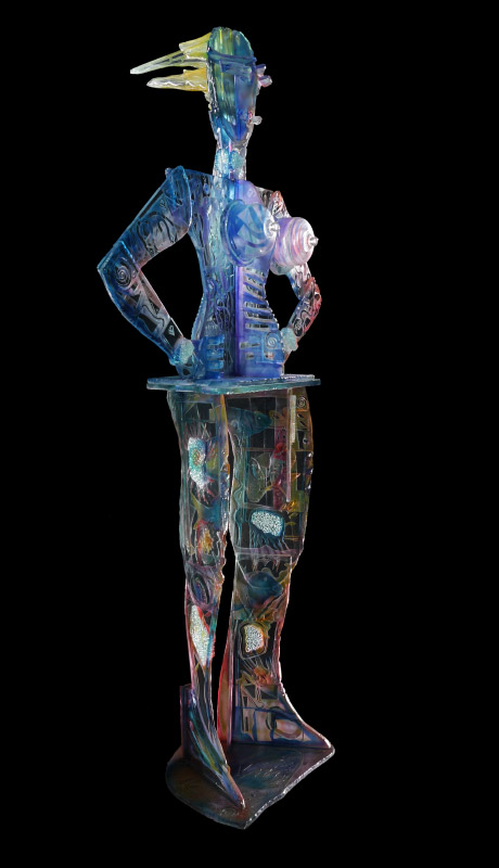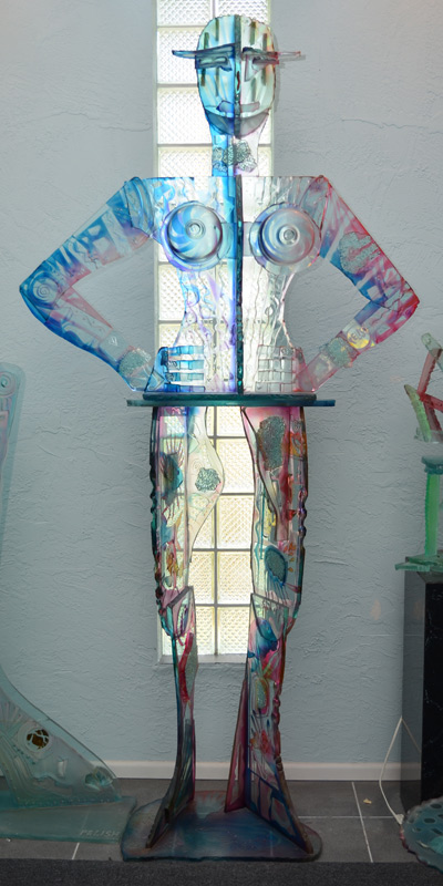 PELISH, Susan, (American, 20th Century): Amazonian in stature art glass sculpture in the form of a woman. Multi hued frosted, etched, and welded glass. Signed Pelish on arm.