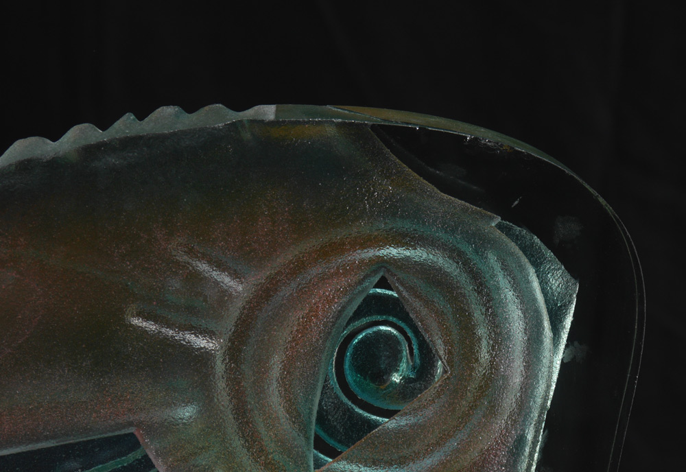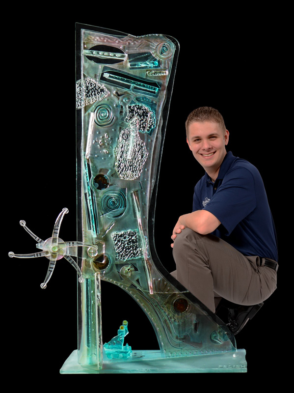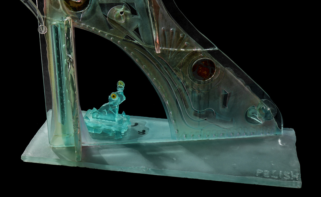 PELISH, Susan, (American, 20th Century): Art glass sculpture in the form of a cowboy boot with articulated spur, small animal beside it, affixed to base. Multi hued frosted, etched and welded glass. Overall measures approx. 60'' h. x 40'' x 16''.