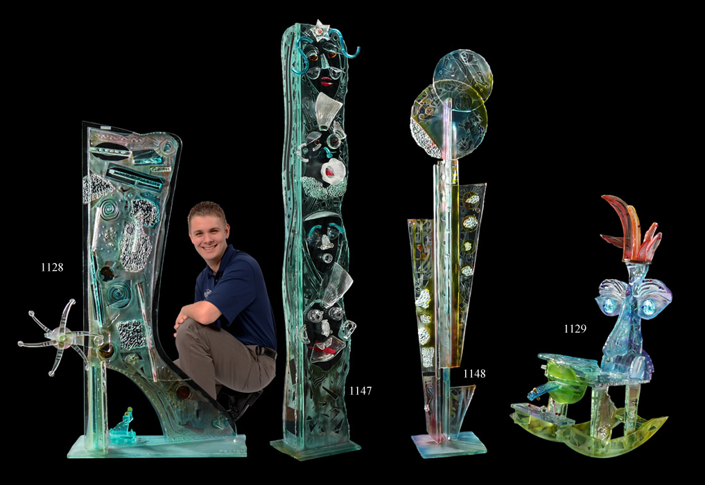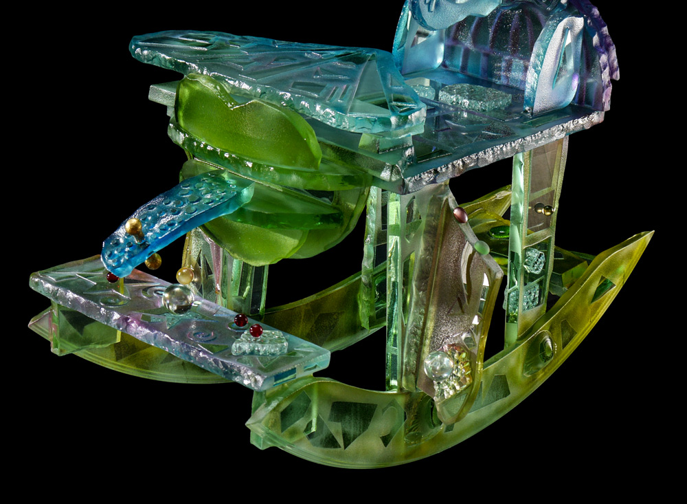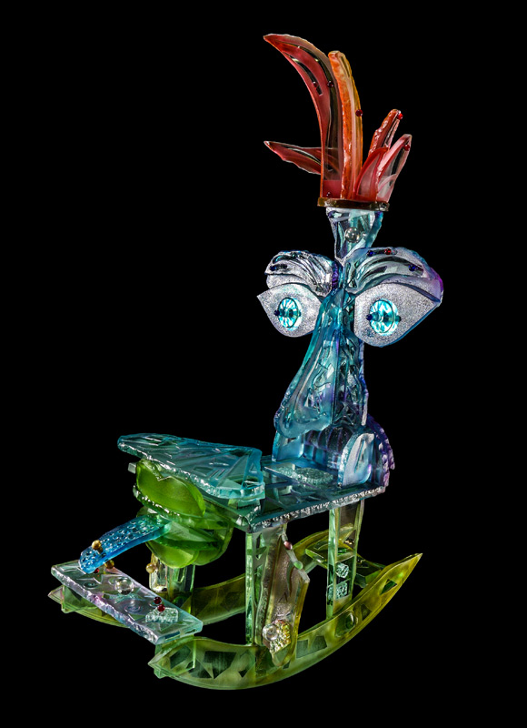 PELISH, Susan, (American, 20th Century): ''Punk Rocker'' art glass sculpture in the form of a rocking chair with figural face back and hair. An assortment of frosted, etched and welded glass colors. Measures 51 1/2'' h. x 19 1/2'' x 34''.