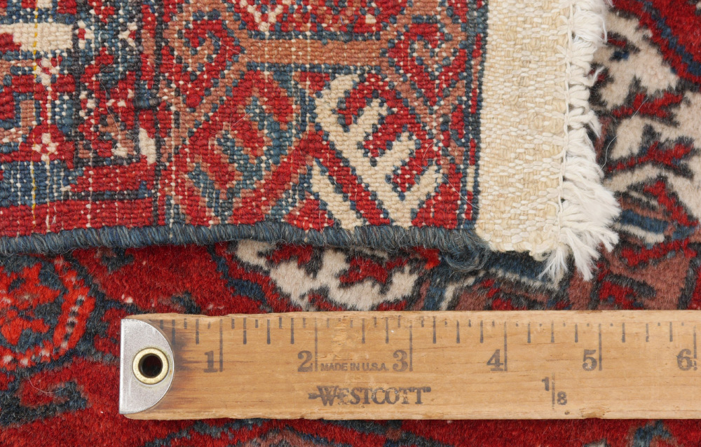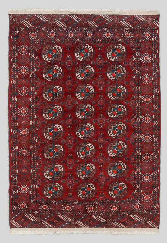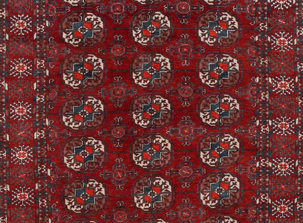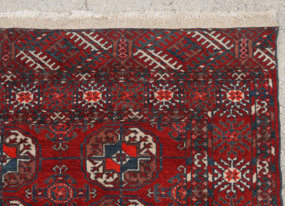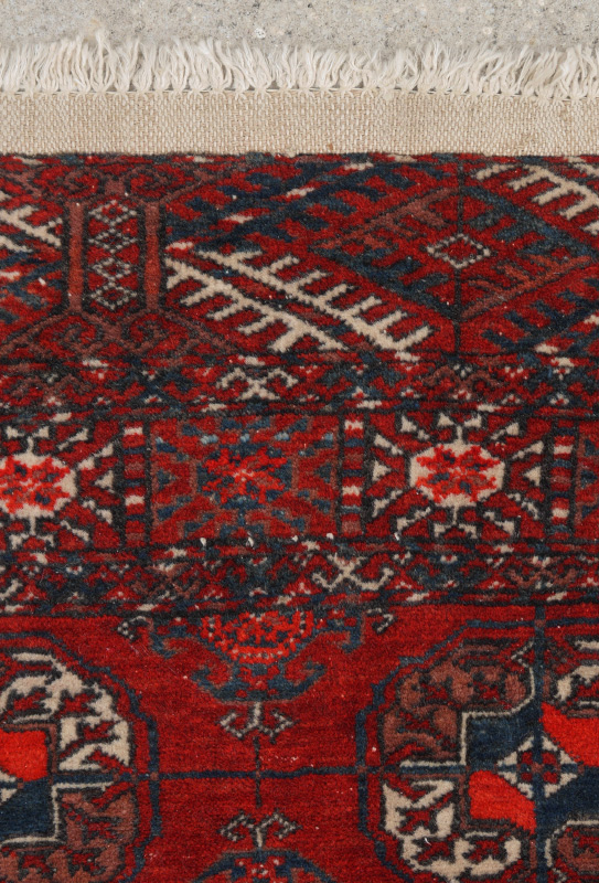 APPROX. 40-60 YR. OLD TURKOMAN BOKHARA HAND KNOTTED WOOL RUG, 3'7'' x 4'10'': This traditionally patterned rug has alternating rows of two different patterns of ''guls''. One is the rounded ''elephant foot'' gul and one a diamond compass. The white accents in the guls really stand out on the clear red of the field. The multiple small borders and the apron or added border found at each end complete the format of this Turkoman rug.