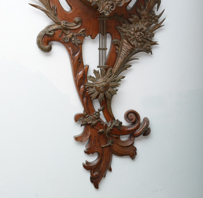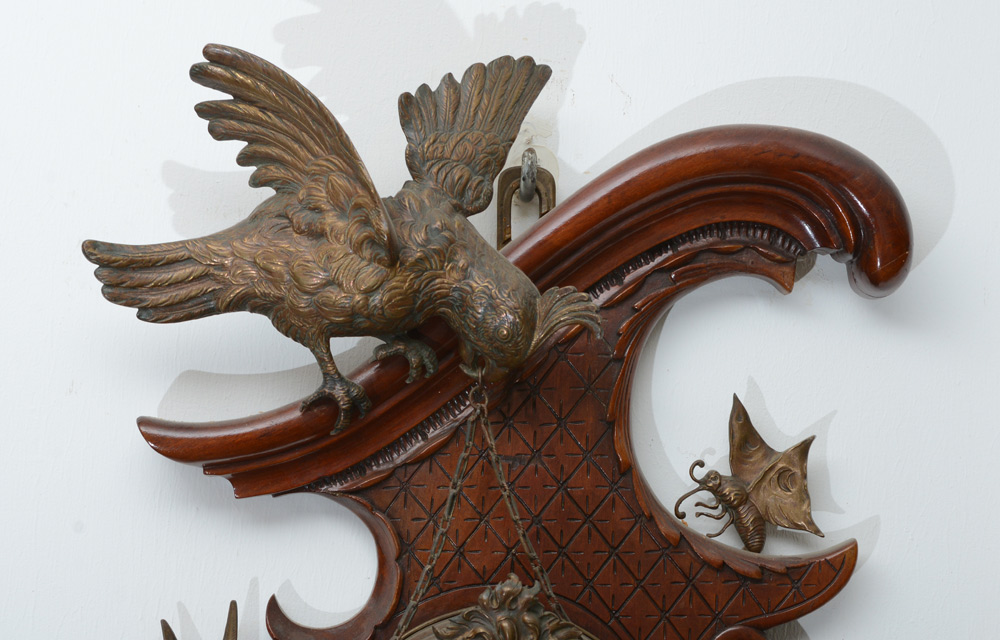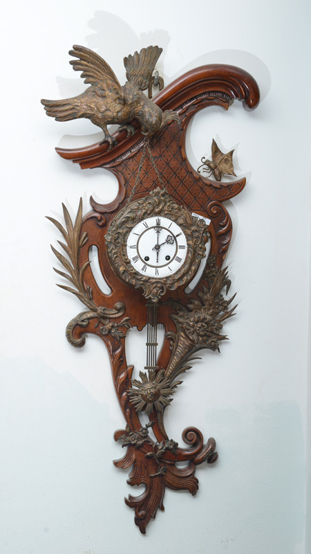 FRENCH BRONZE & WOOD FIGURAL ROCOCO WALL CLOCK: Carved and shaped case with applied gilt bronze bird holding chain, butterfly, foliate and scroll decoration. German time and strike movement marked CW, porcelain dial with Roman numerals. 43'' x 18 1/2'' x 4 3/4''.