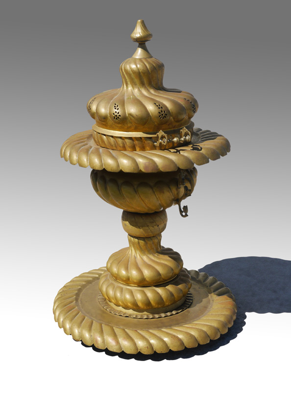 TURKISH BRASS BRAZIER: Embossed brass body, pierced lid, removable base with engraved dedication. Overall with base measures 40'' h. x 26'' dia.