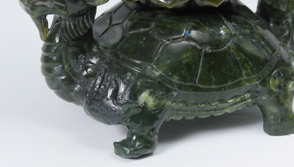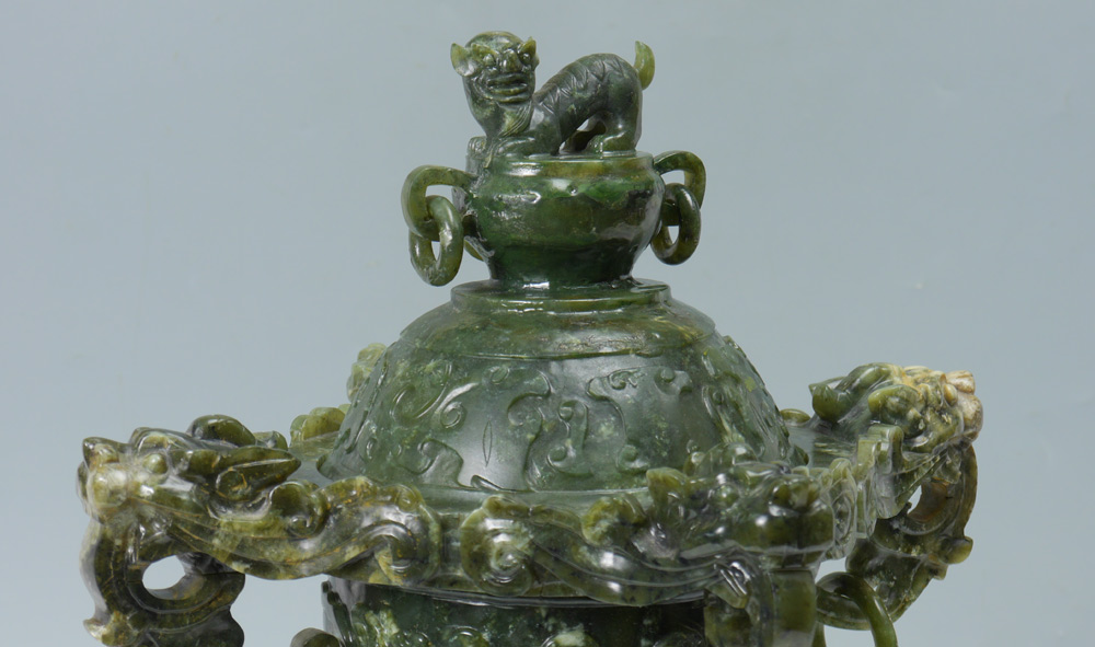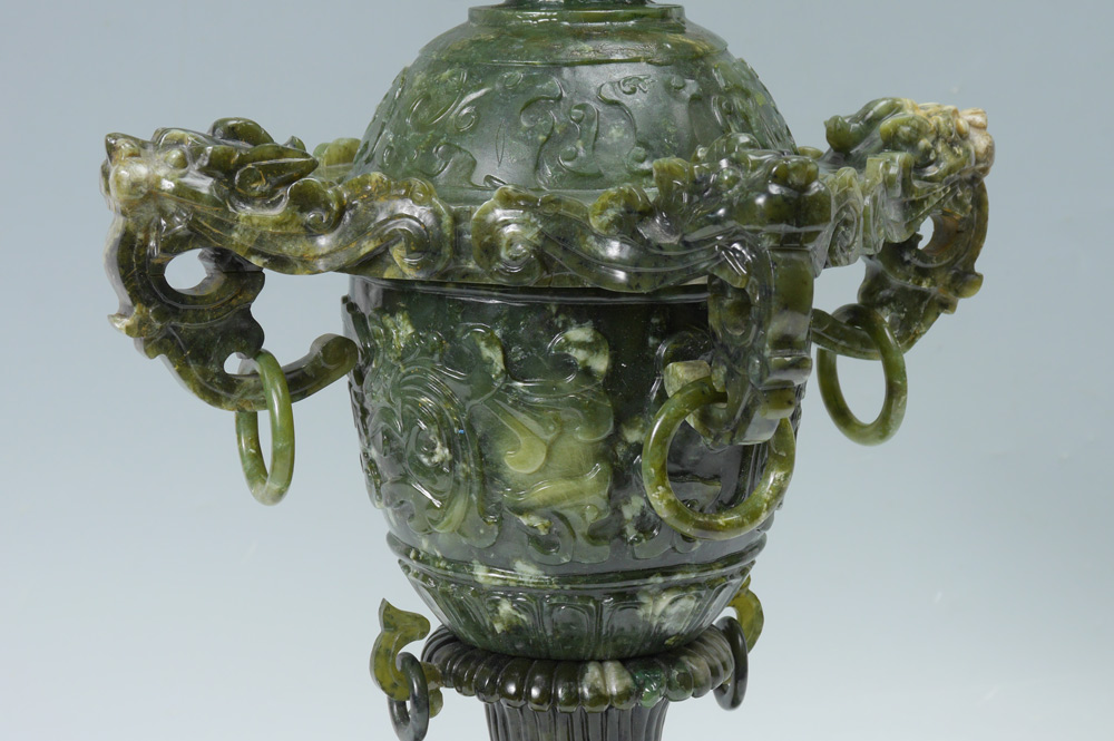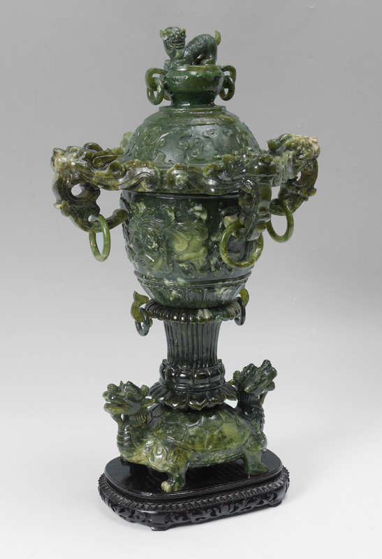 LARGE CHINESE CARVED SERPENTINE CENSOR: Lid with foo dog final and ringed handles. Body with 4 carved lion head masquerons with ring at lip, foliate and fluted body on double headed Siamese dragon turtle base. Overall measures 20 1/2'' h. x 13 1/4''. Sold with a fitted carved wood base, 1 3/4'' h. x 9 1/2'' x 6 3/4''.