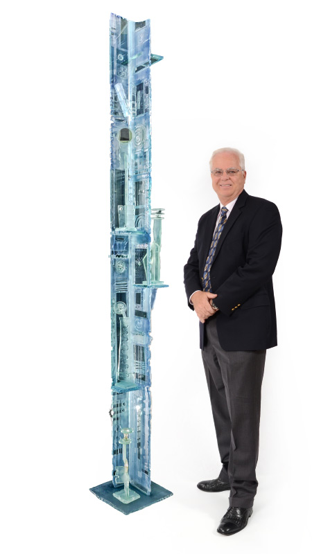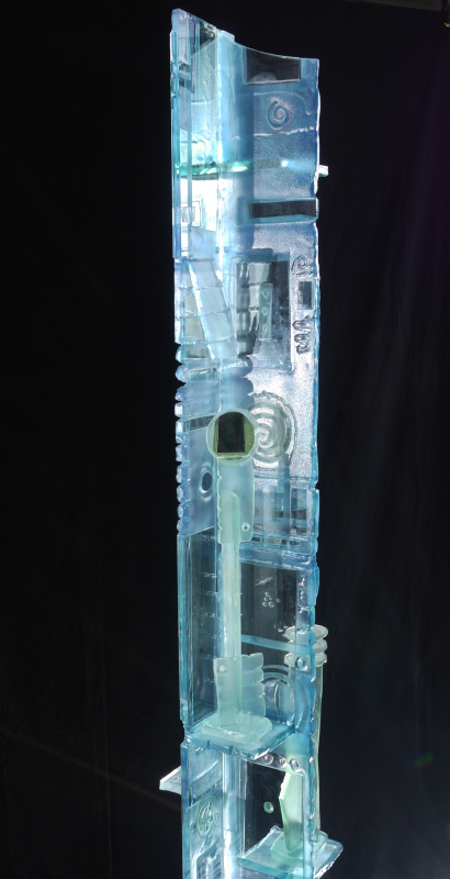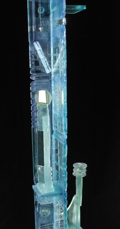 PELISH, Susan, (American, 20th Century): Blue Glass Totem art glass sculpture, frosted, etched and welded glass with multiple shelves, measures 108 1/2'' h. x 14'' x 14''. Sold with an assortment of glass accent pieces for shelves, tallest 23'' h.