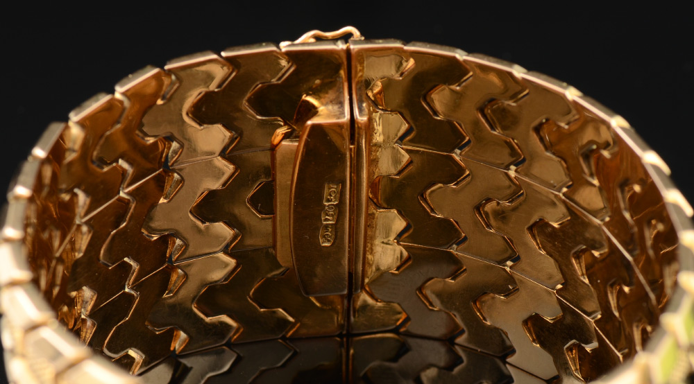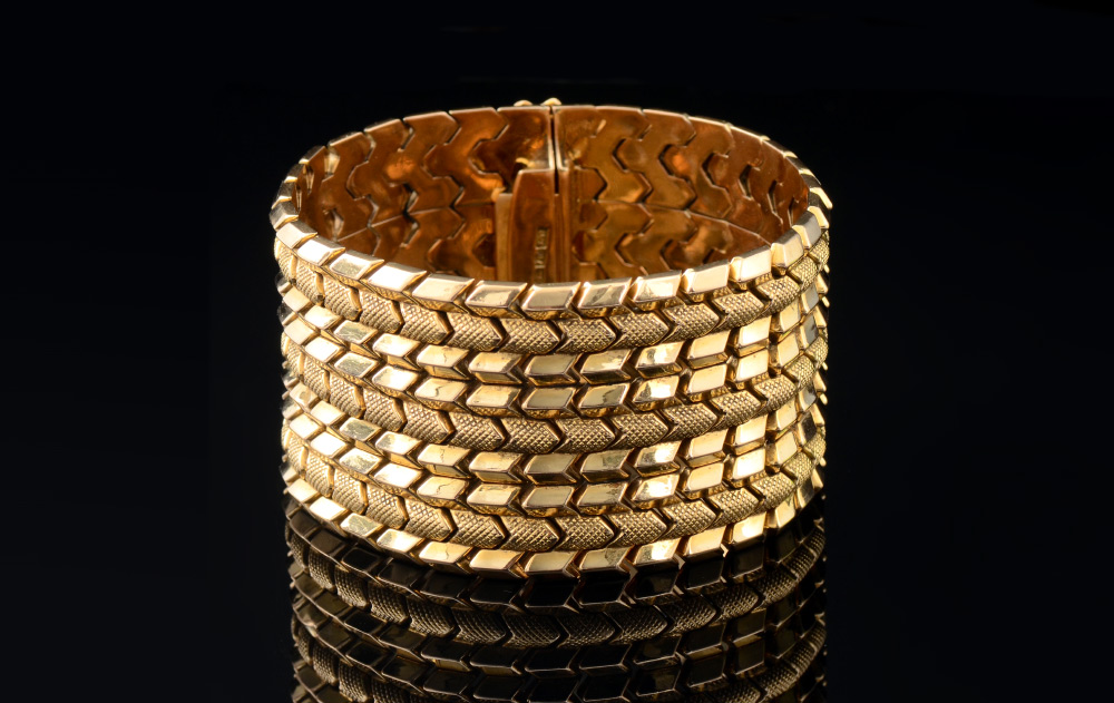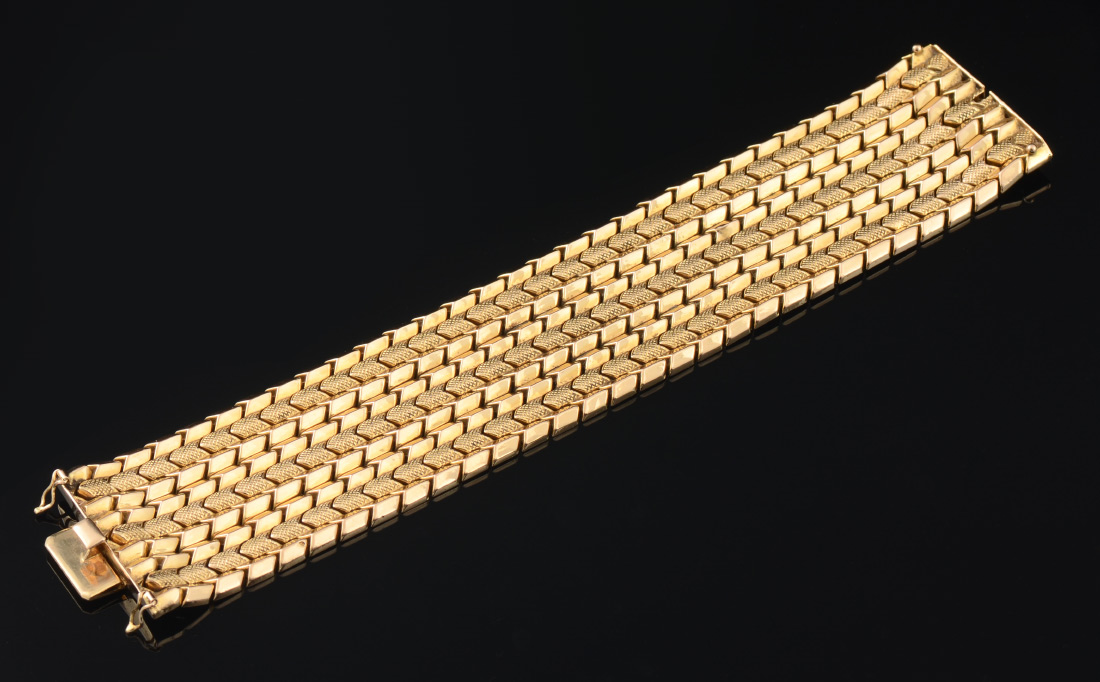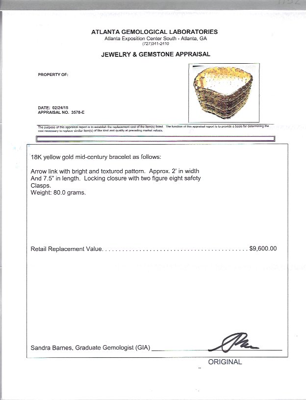 18K MID CENTURY GOLD BRACELET: 18K yellow gold arrow link bracelet in an alternating 9 rows of polished and textured finish. Stamped 750 FOT and illegible stamp. Width: 2''. Length: 7.5''. Weight: 80 grams. Sold with current Atlanta Gemological GIA graduate's appraisal for $9600.