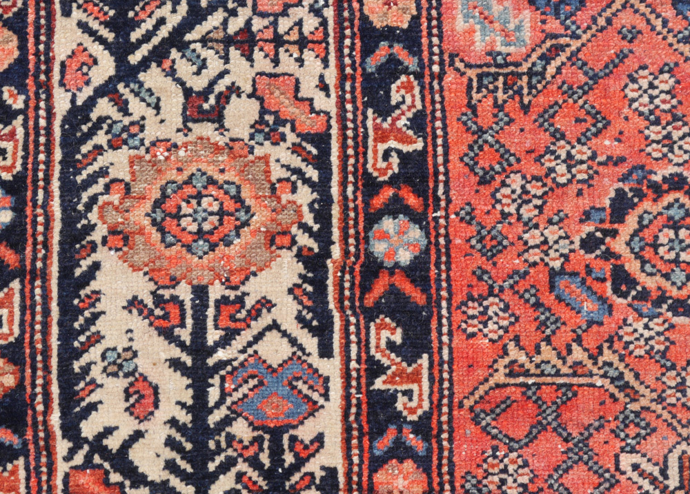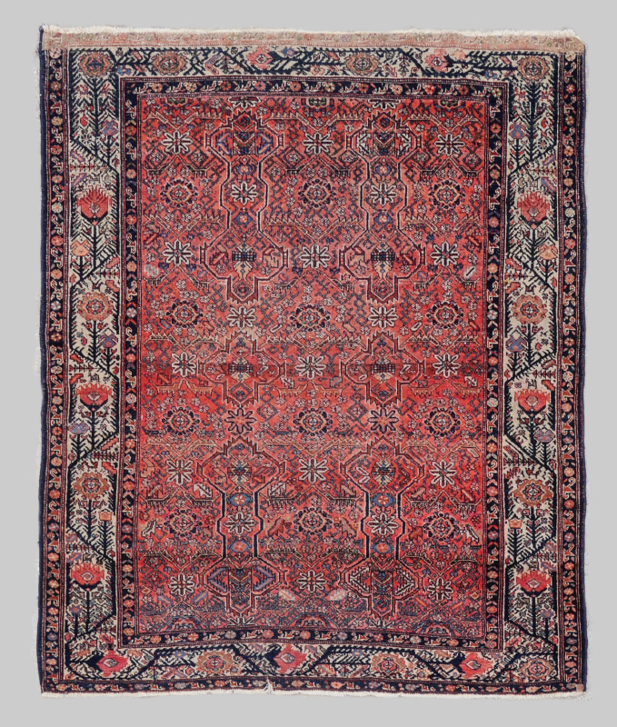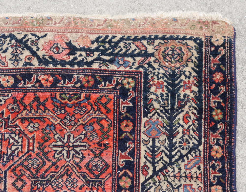 ANTIQUE PERSIAN HAND KNOTTED WOOL RUG, 5'2'' x 6'1'': We believe this to be a Kurdish Persian rug. It has an amalgam of various archaic design patterns, including a Herati design, which have been put together to create an interesting and different combination. The deep salmon colored field makes a good background for the blues, reds, white, and black colored motifs that cover it. The white ground main border also has a striking design of a black continuous angled vine that has large flower heads that are all ''growing'' in the same direction.