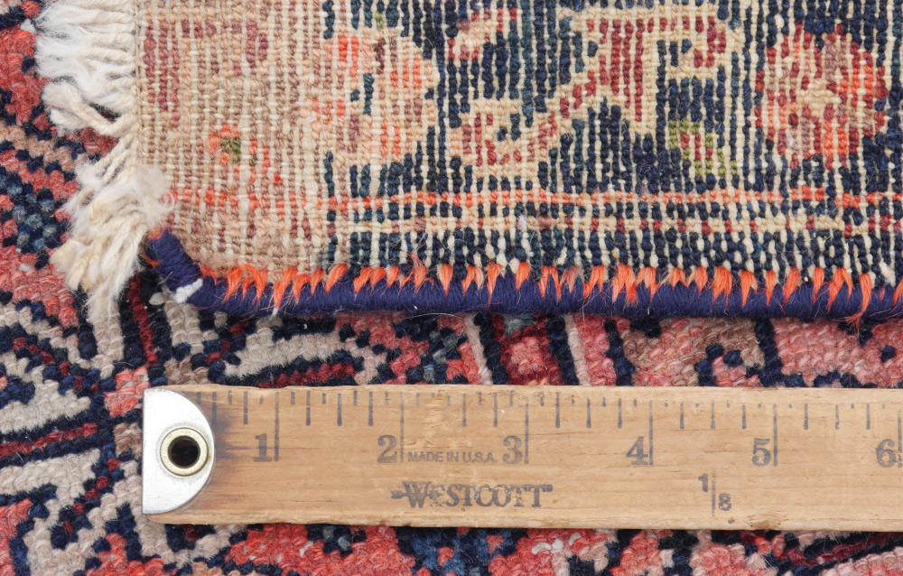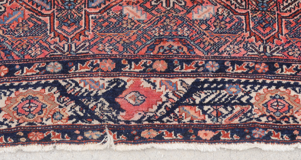 CONDITION: There is some color run, the pile is evenly low, the sides have been re-done and there are some small old repairs. Also there is a dramatic color change at one end which is how the rug was made originally.
