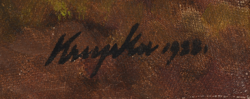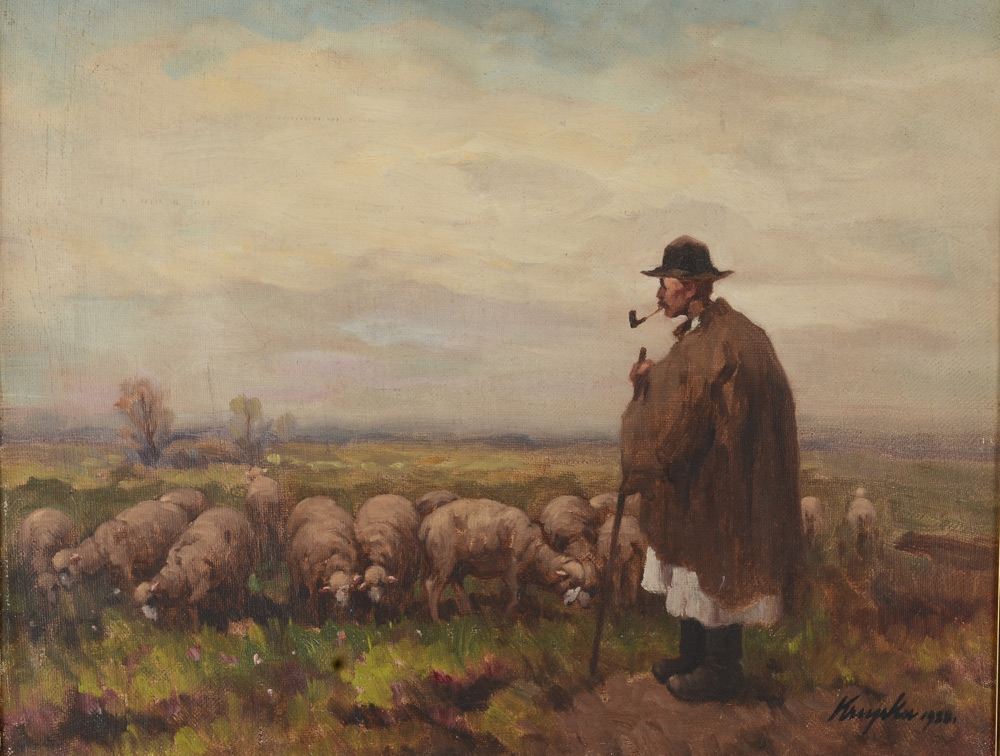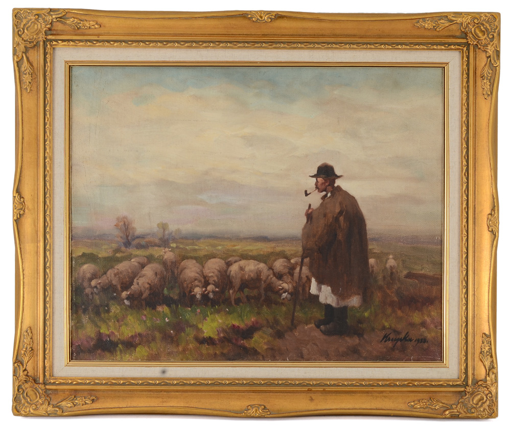 FERENC KRUPKA PAINTING SHEPHERD AND HIS FLOCK: Oil/Canvas, 16'' x 20'', signed lower right and dated 1928, framed, 21 1/2'' x 25 1/4''.