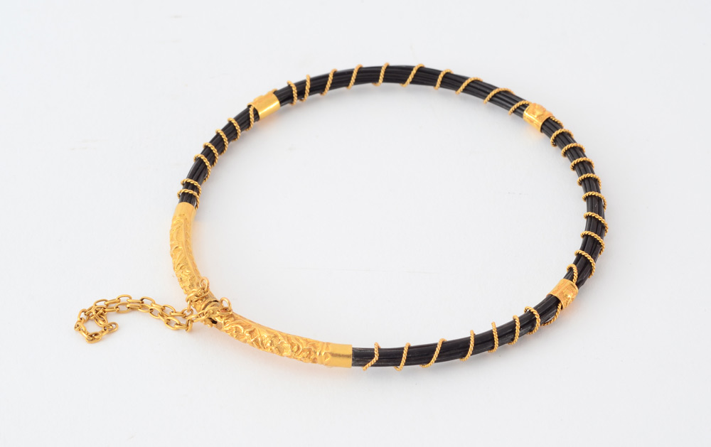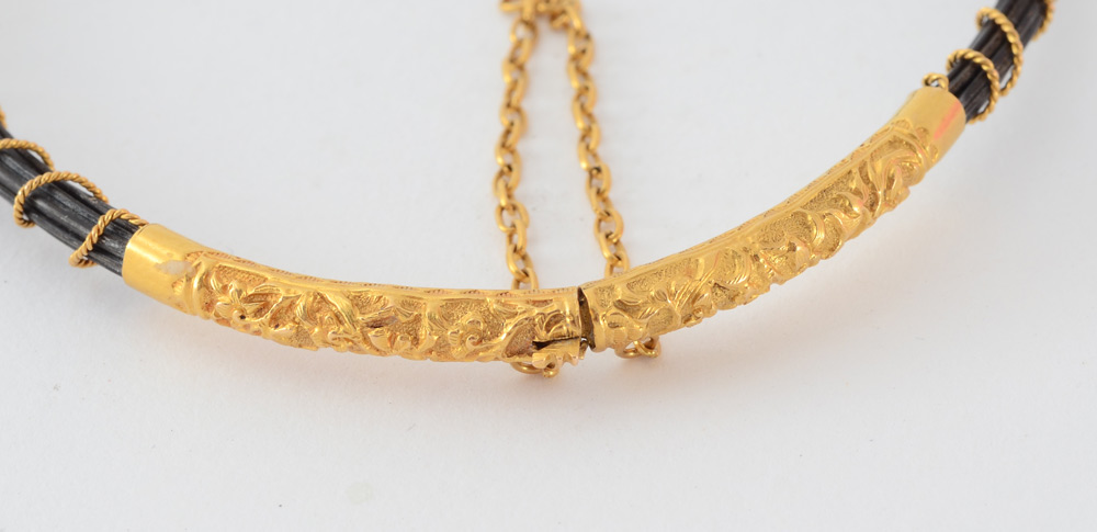 VICTORIAN ELEPHANT HAIR BRACELET: 18K yellow gold mountings, clasp and safety chain. Dia. 2 1/2''. Overall weight 4.1 grams.