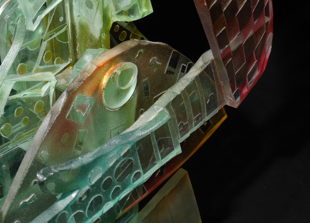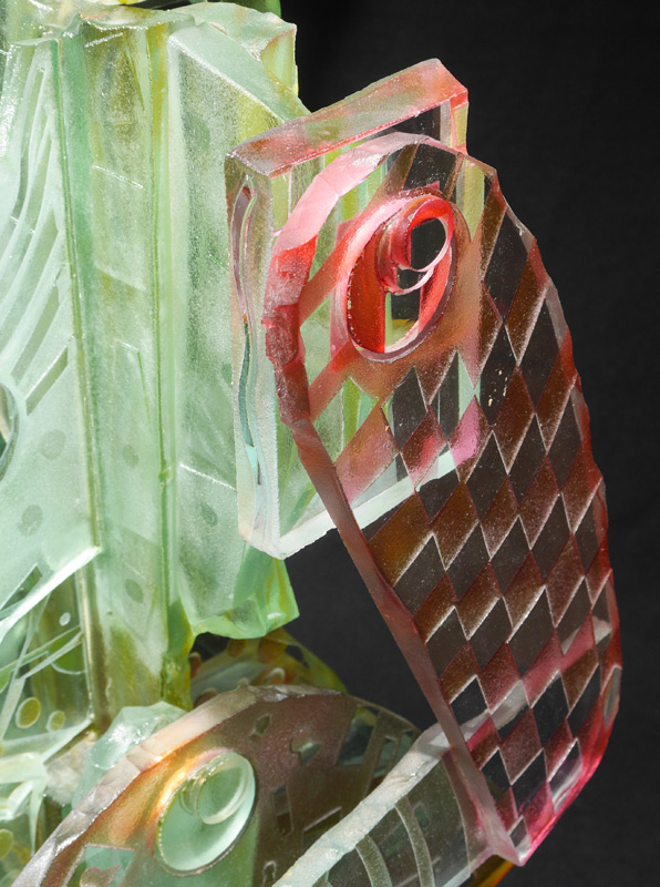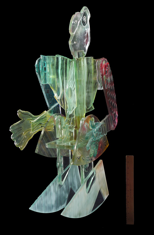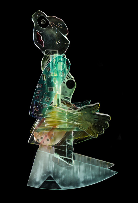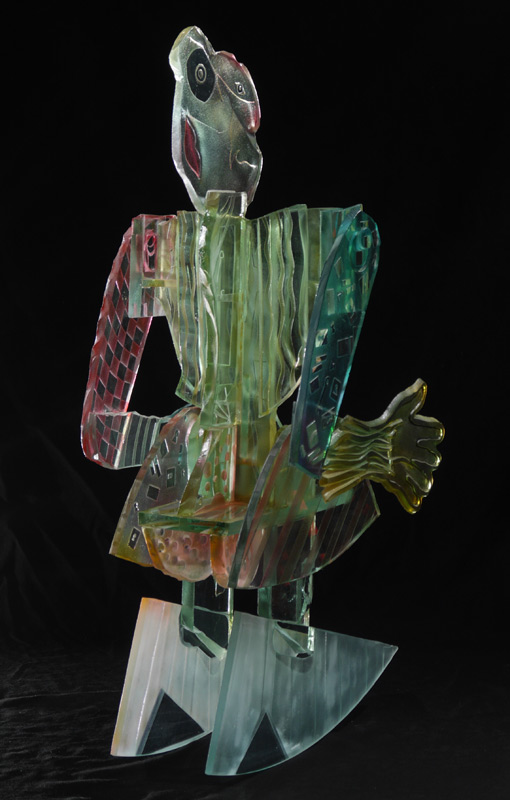 PELISH, Susan, (American, 20th Century): Art glass figure of a woman's bust on rocking base, multi hued frosted, etched and welded glass. Measures 39'' h. x 16'' x 19 1/2''.