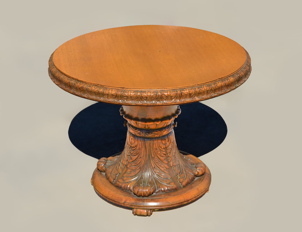 ACANTHUS LEAF CARVED BREAKFAST TABLE: Round top with carved foliate trim, pedestal base with acanthus leaf motif, on 4 scroll feet. Measures 29'' h. x 38'' dia.