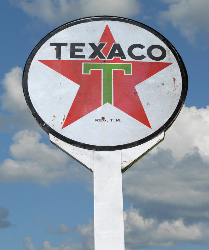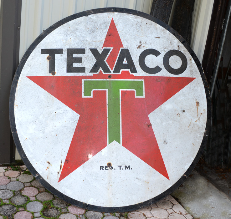 LARGE TEXACO PORCELAIN SIGN WITH STAND: Texaco porcelain double sided gas station sign, 71 1/2'' dia. Sold with the approx. 18' 6'' rarely found and often scrapped cast metal stand for display.