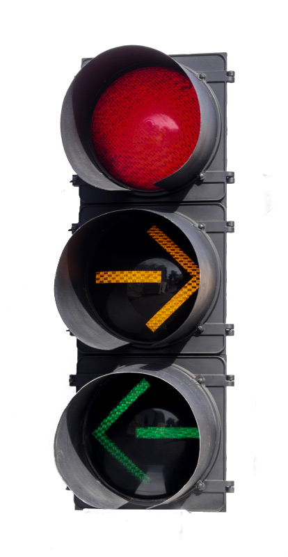 TRAFFIC LIGHT SIGNAL: 3 light with full red, yellow arrow pointing one way, green arrow the other, wired for electrical socket, overall measures 40 1/2'' h. x 15'' x 16''.