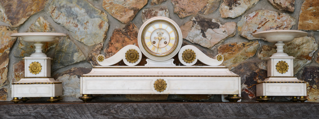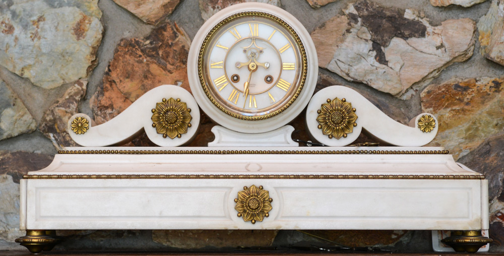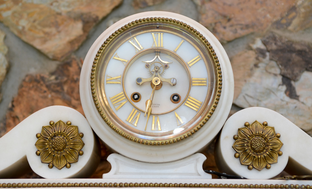 FRENCH CARVED WHITE MARBLE CLOCK SET: Carved white marble case with medallion center and scroll accents. Removable brass accent at center, on 4 gilt metal feet. Porcelain dial with open escapement, applied gilt metal Roman numerals, dial marked Mortier A Gand. Time and strike movement marked E.V., overall measures 14'' h. x 26'' x 7 3/4''. Sold with matching compote garniture set, 11 1/2'' h. x 9''.